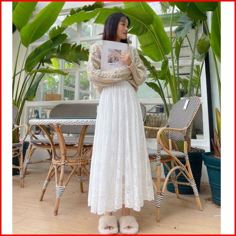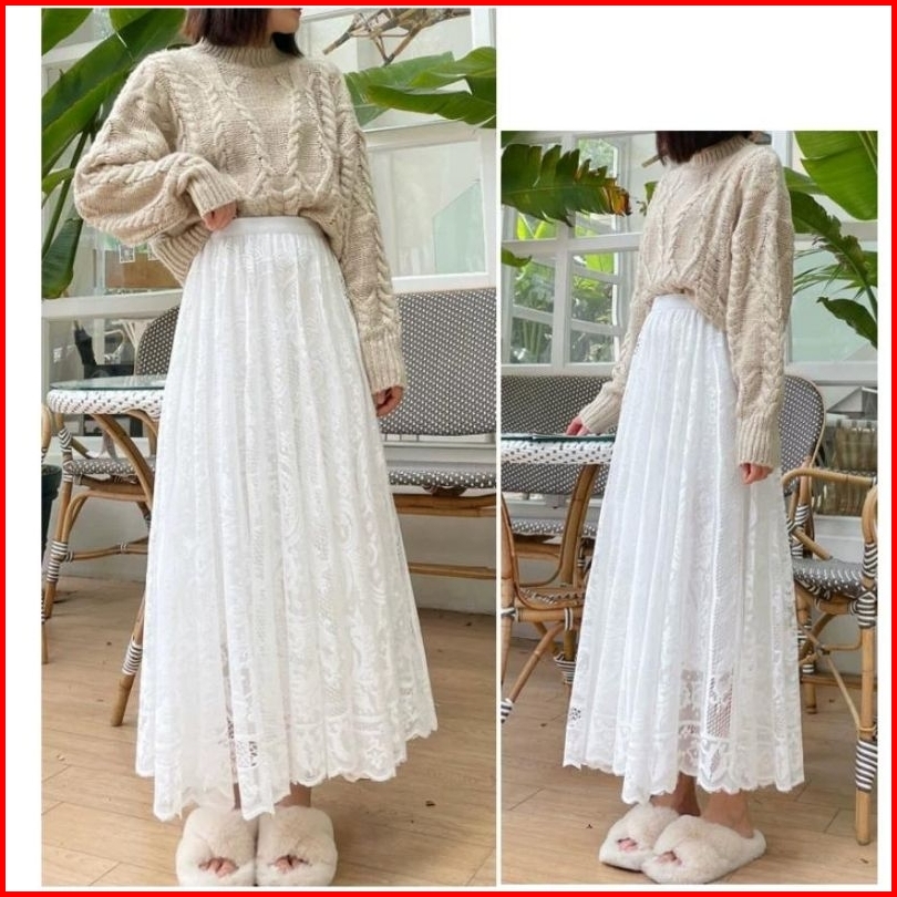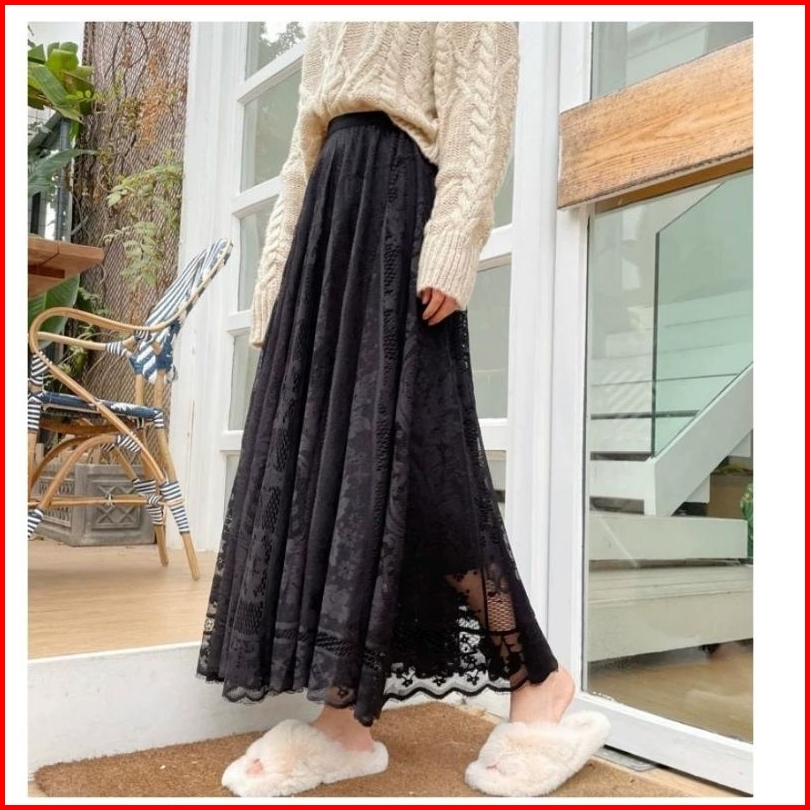 9722 Rok Panjang Elijah Lace Elastic Waist Maxi Long Skirt Tutu Tile Brokat Hitam.cream Putih Polos Korean Style Wanita