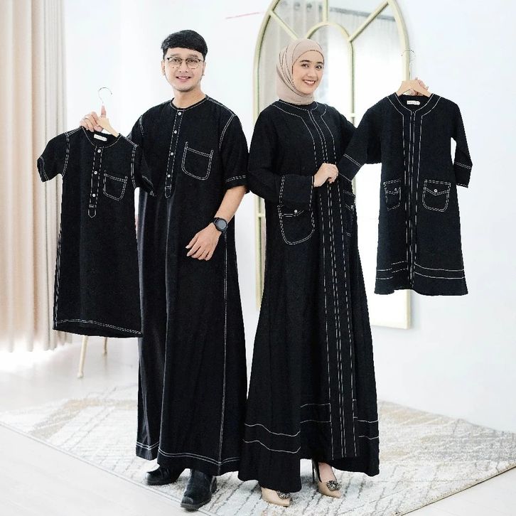 Aviza Couple Sarimbit Black Series Jubah Abaya Set Lebaran Keluarga 2026 Bahan Lembut Nyaman Syari