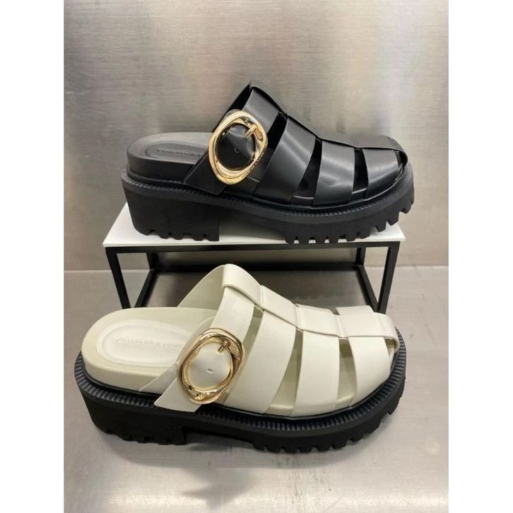 CHARLES & KEITH Sepatu Mules Oval-Buckle Interwoven 7058 Black Color size 38