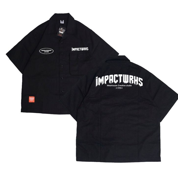 IMPACT WEARHOUSE | KEMEJA TANGAN PENDEK | COTTON TWILL | FLOCKING BLUDRU | BOXY | HITAM | DEVELOPEMENT
