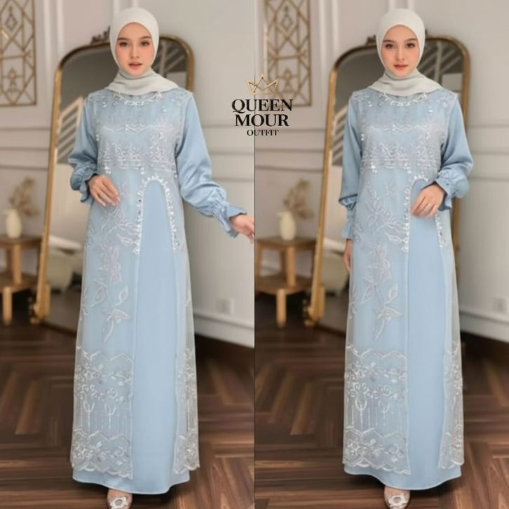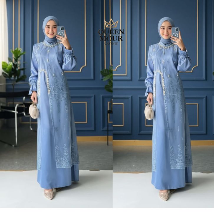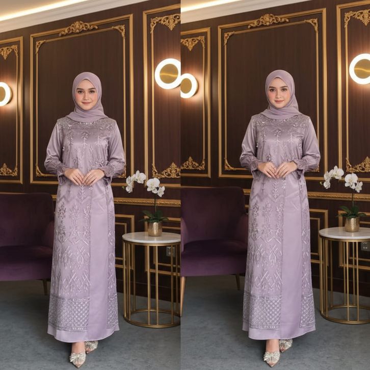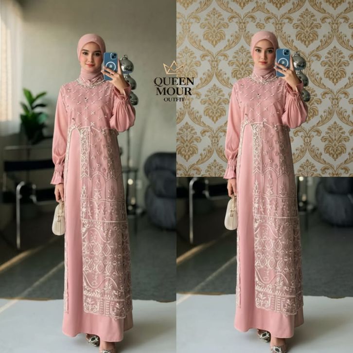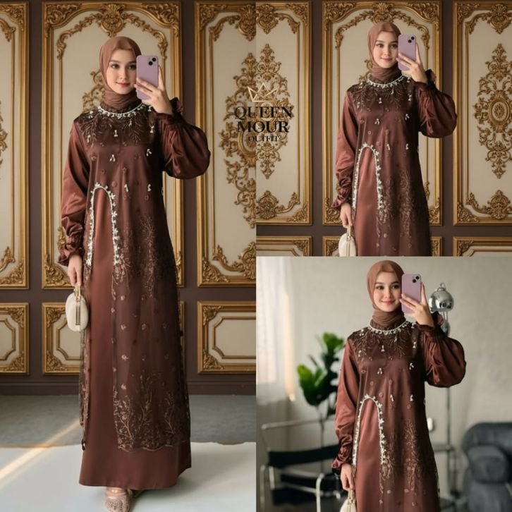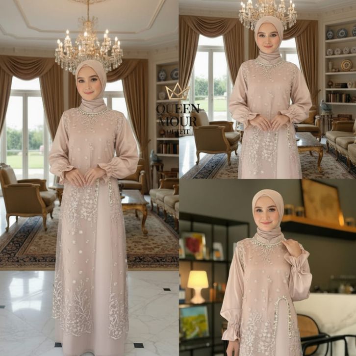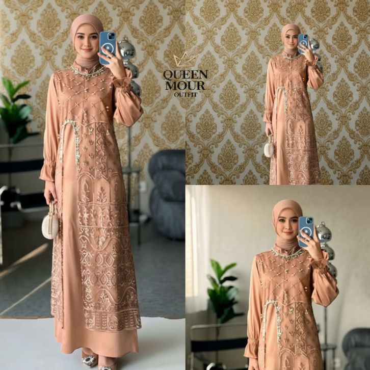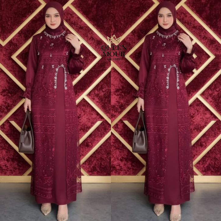 Marsya Dress Silk Burgandy Set Outer Brukat Aplikasi Payet Mutiara Gamis Pesta Wanita Kekinian OOTD gamis lebaran 2026