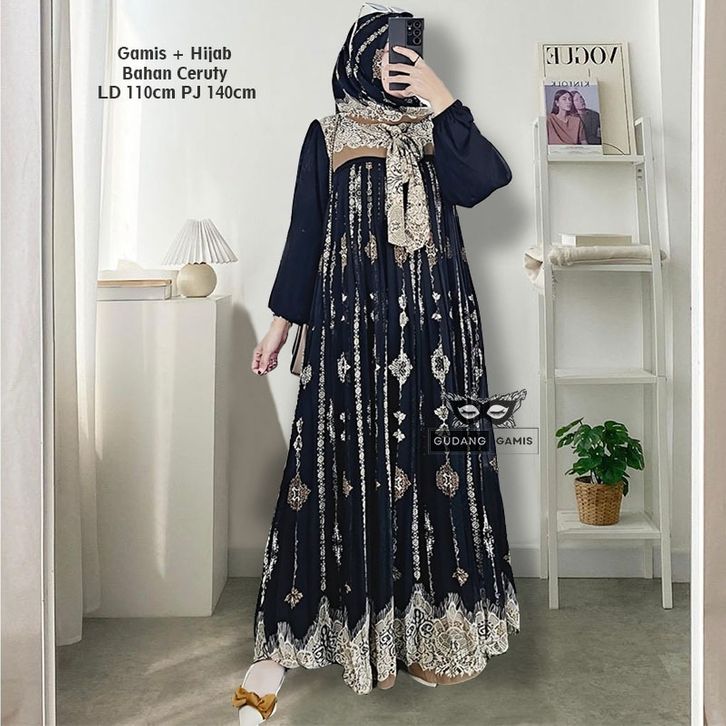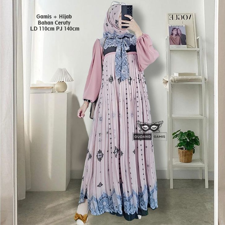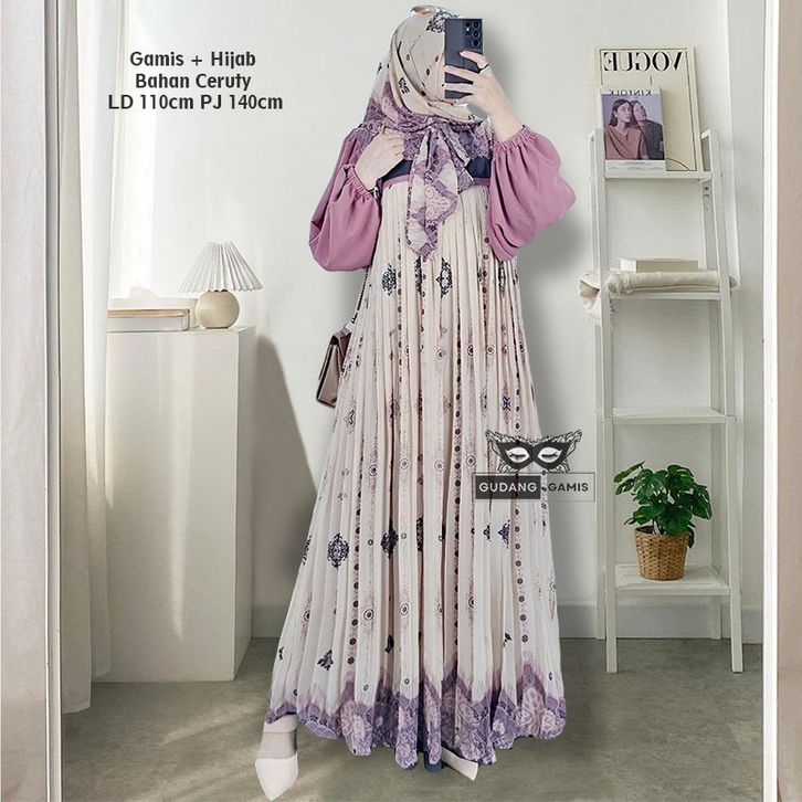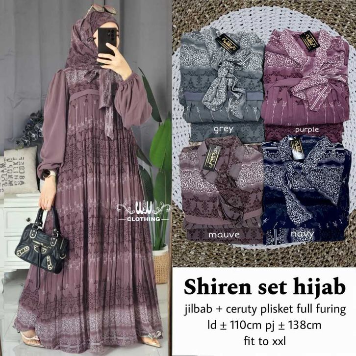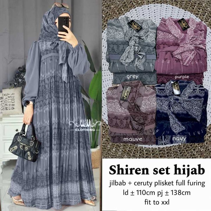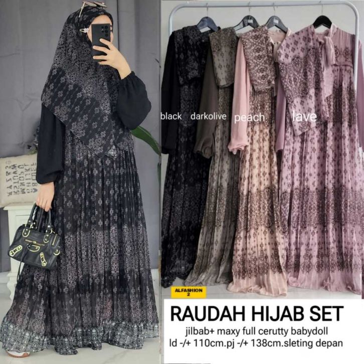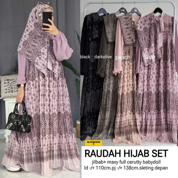 Raudah Shiren Asiqa Hijab Set Gamis Motif Ceruty LD 110cm PJ 137cm Sleting Depan Full Furing Gamis Lebaran 2026 Terbaru