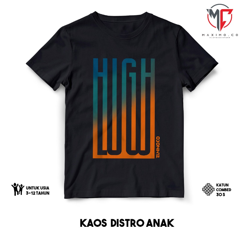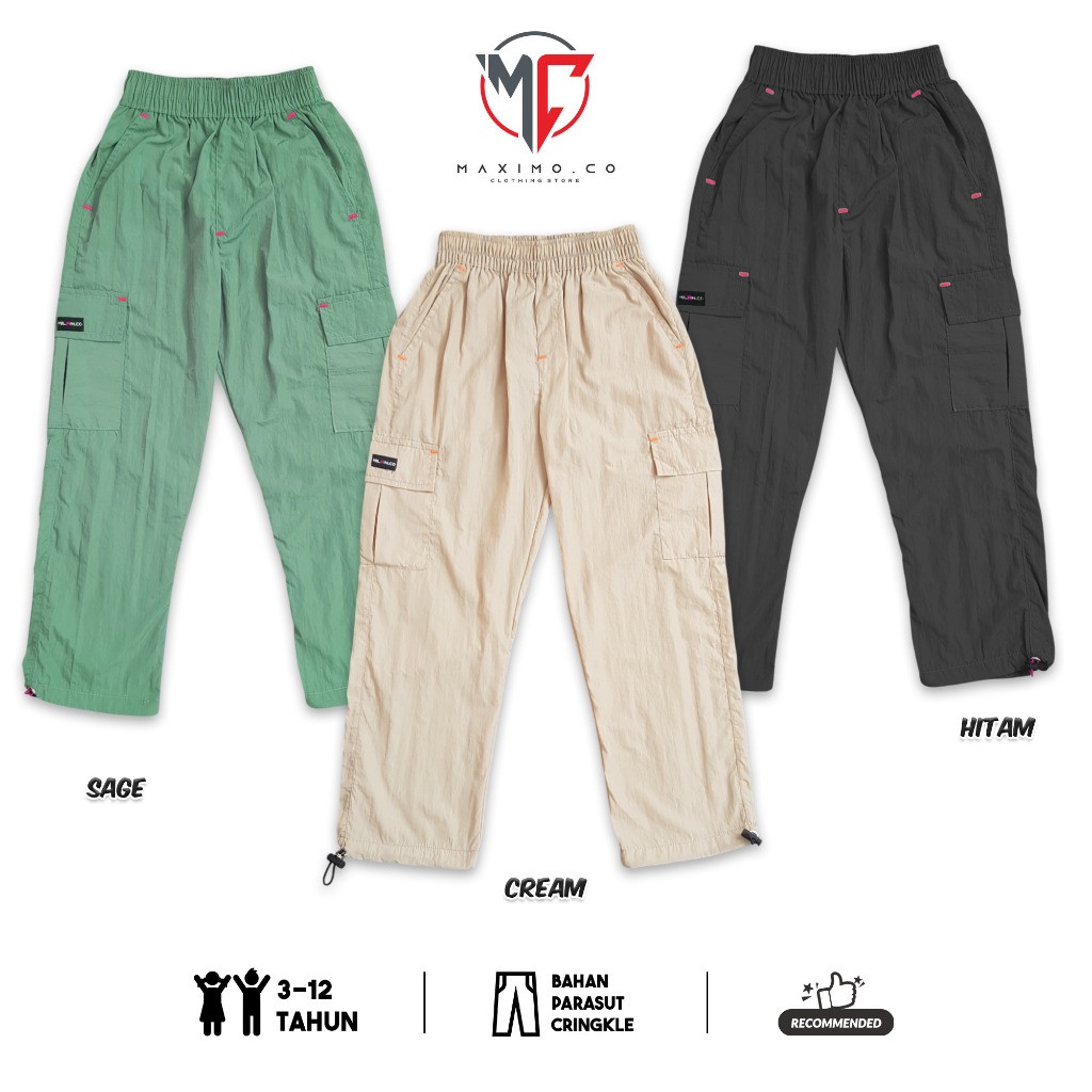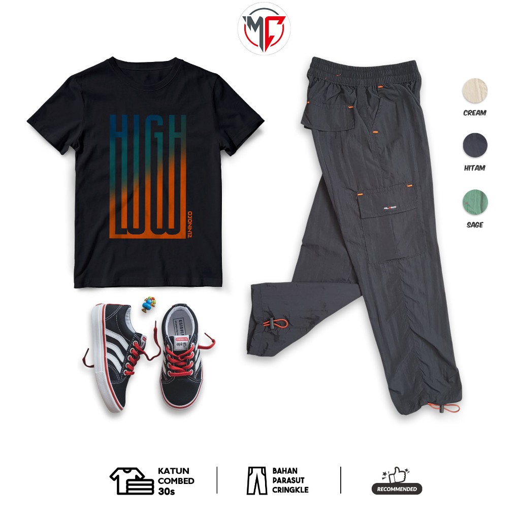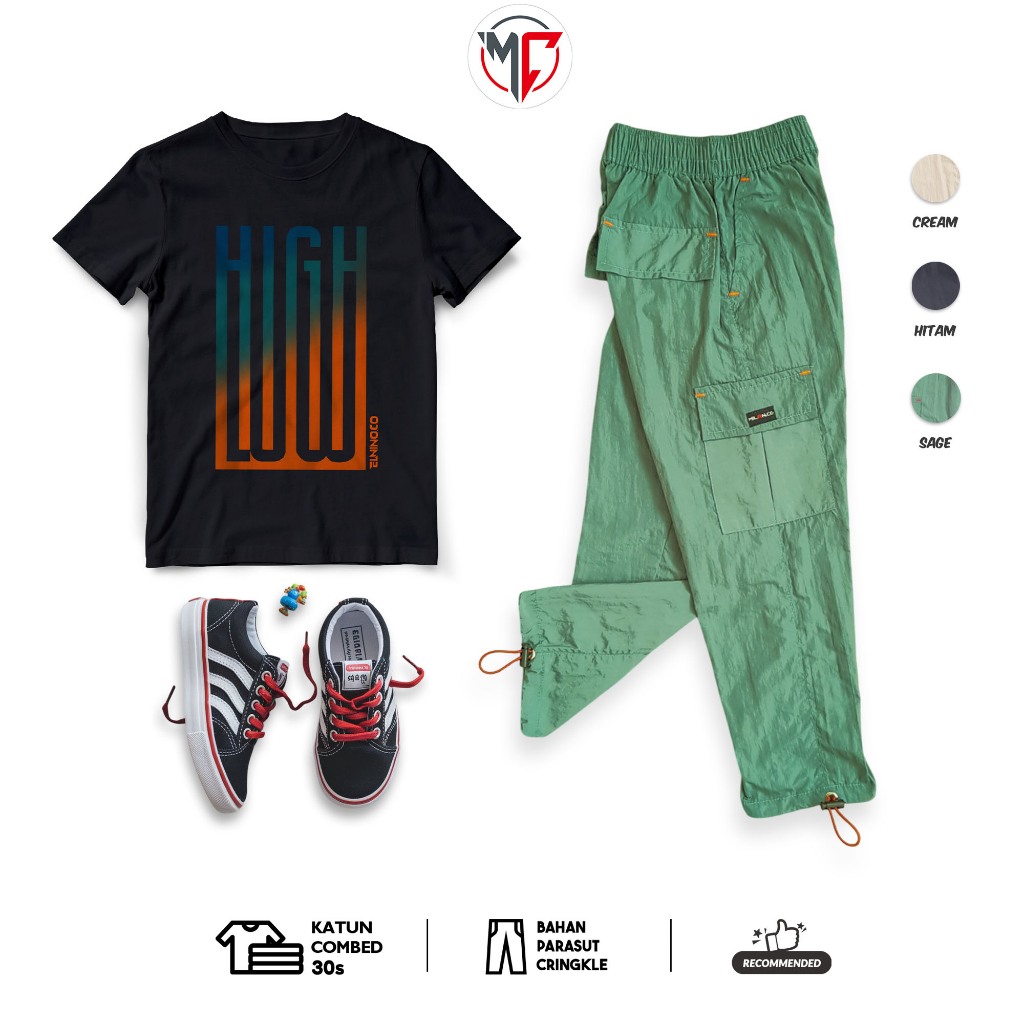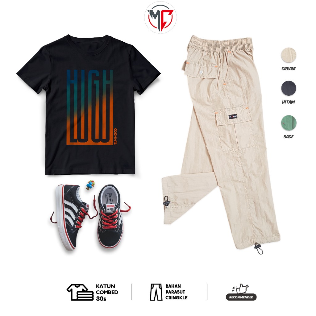MAXIMO.CO SETELAN BAJU DISTRO ANAK HIGH LOW BLACK DAN CELANA KARGO PARASUT PANJANG USIA 3-12 TAHUN