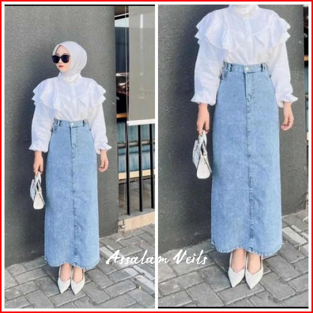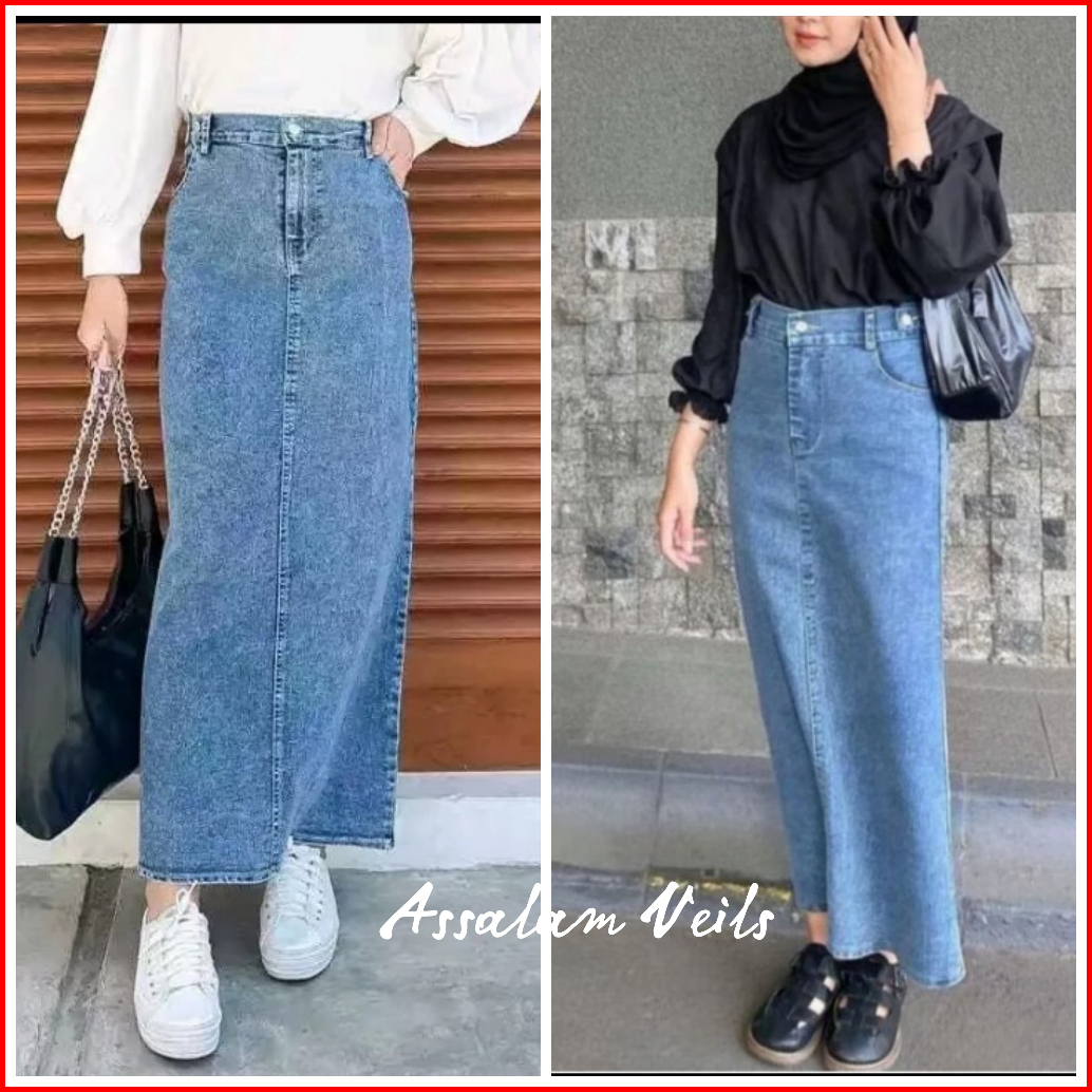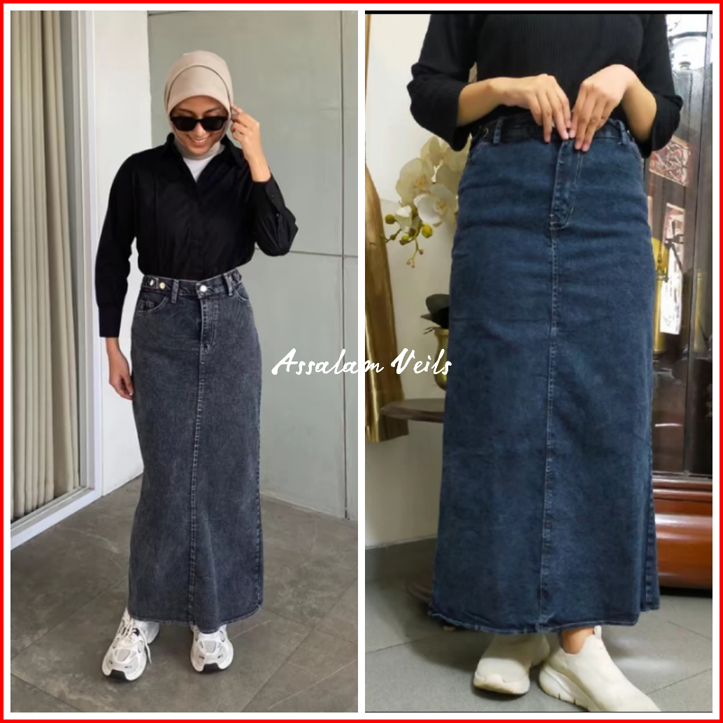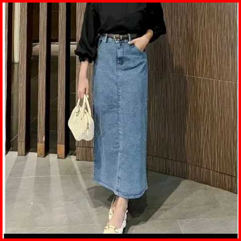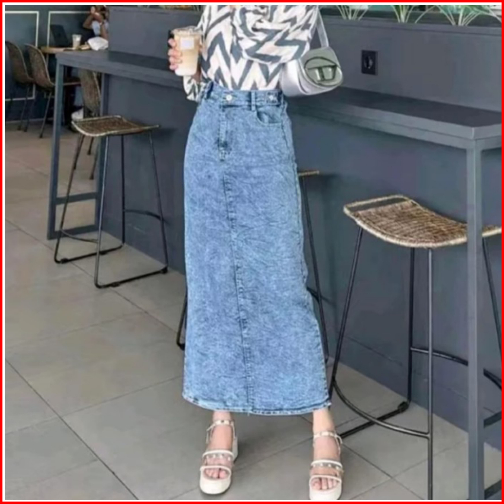Rok Jeans Theana Highwaist Polos Dewasa Belah Belakang Kancing Karet - Wanita
