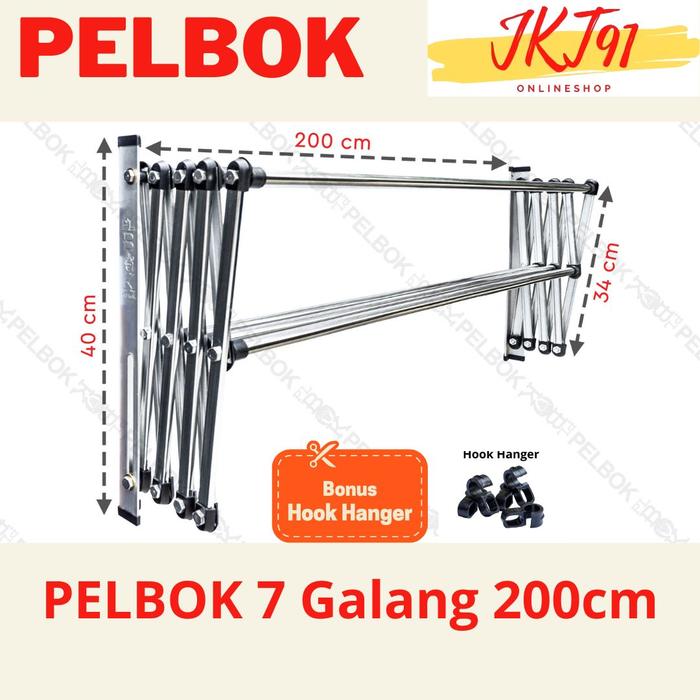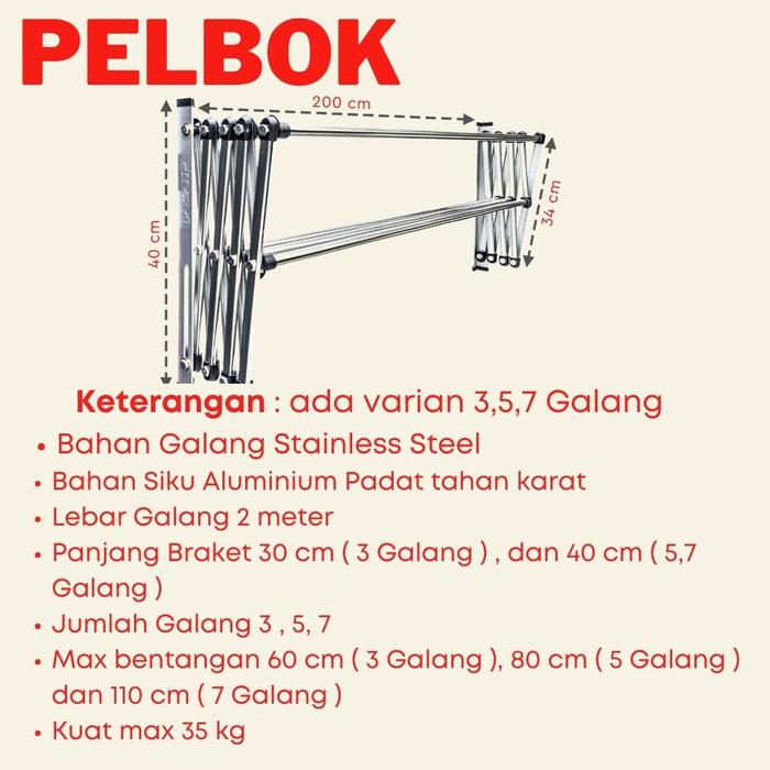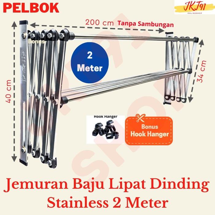 PELBOK JEMURAN BAJU PAKAIAN DINDING LIPAT STAINLESS STEEL RAK JEMURAN 3/5/7 GALANG 200CM Besi Pipa