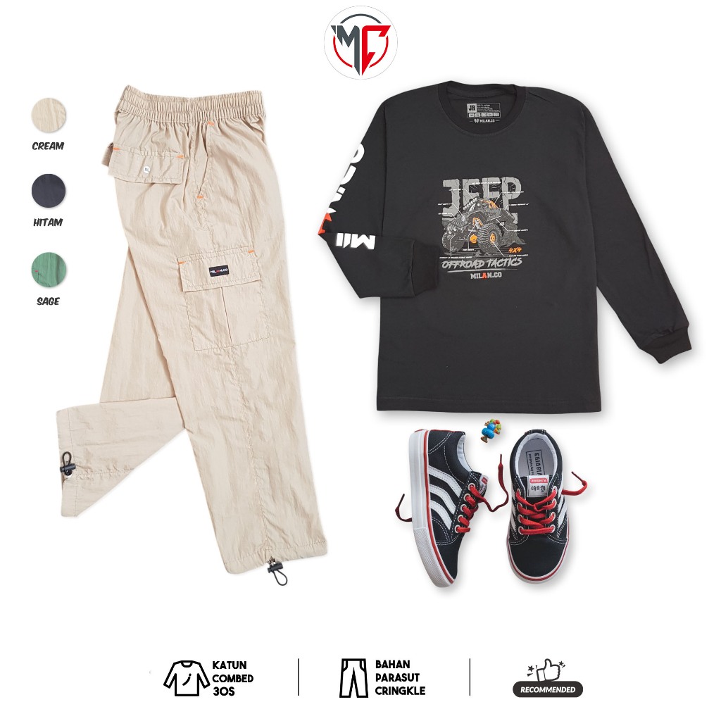 MAXIMO.CO SETELAN BAJU DISTRO ANAK BLACK TACTIC DAN CELANA KARGO PARASUT PANJANG USIA 3-12 TAHUN