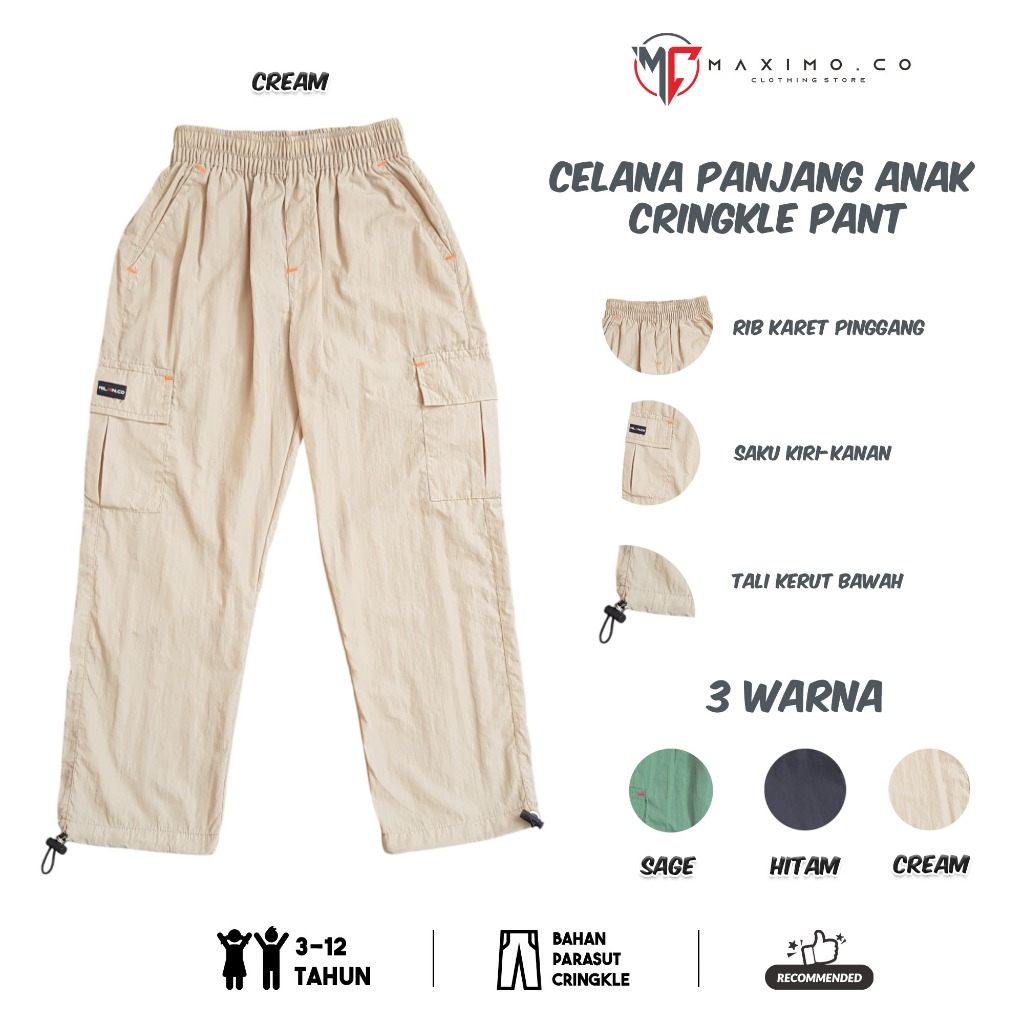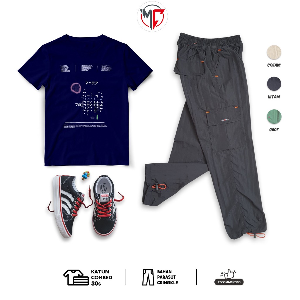 MAXIMO.CO SETELAN BAJU DISTRO ANAK 7878 KANJI DAN CELANA KARGO PARASUT PANJANG USIA 3-12 TAHUN
