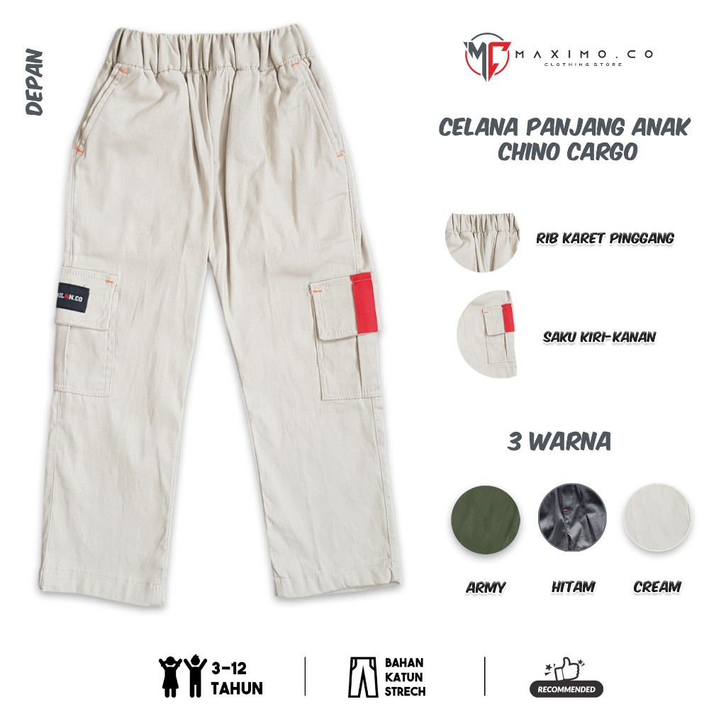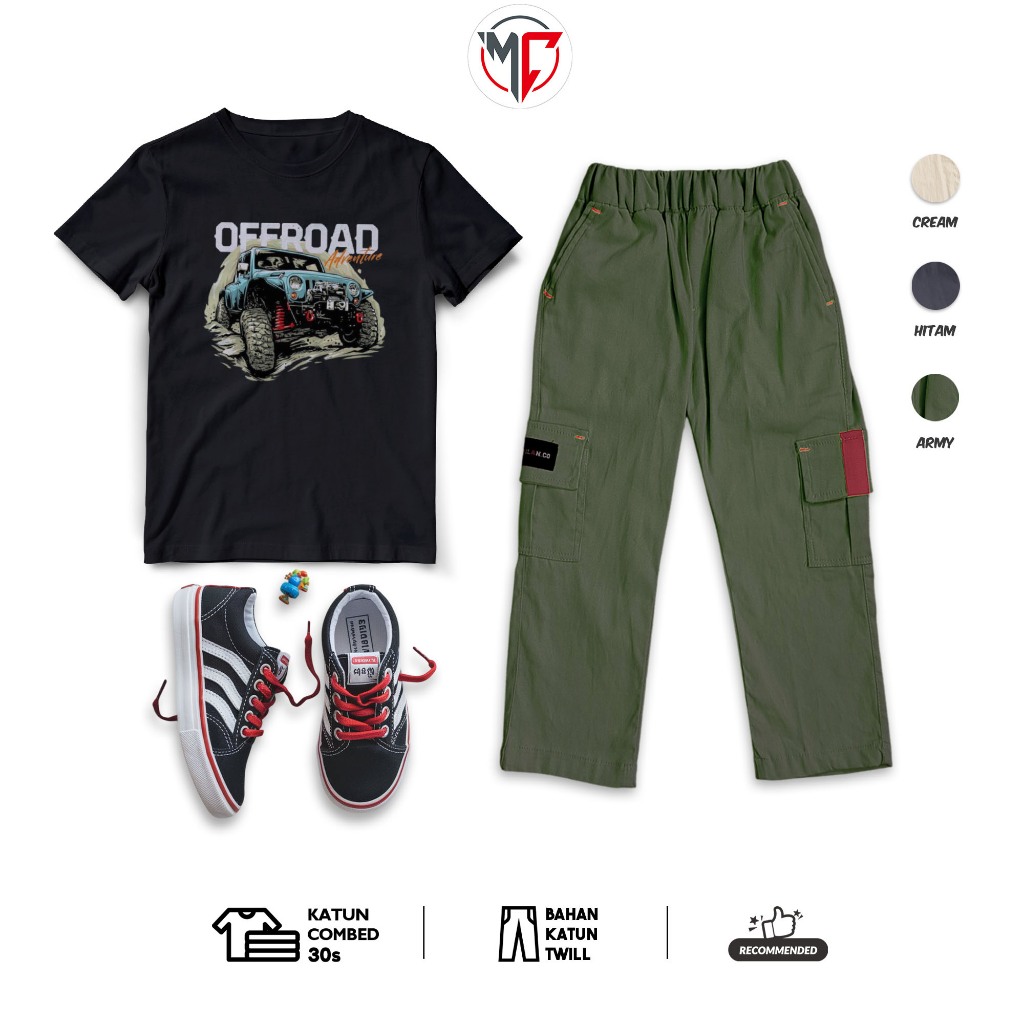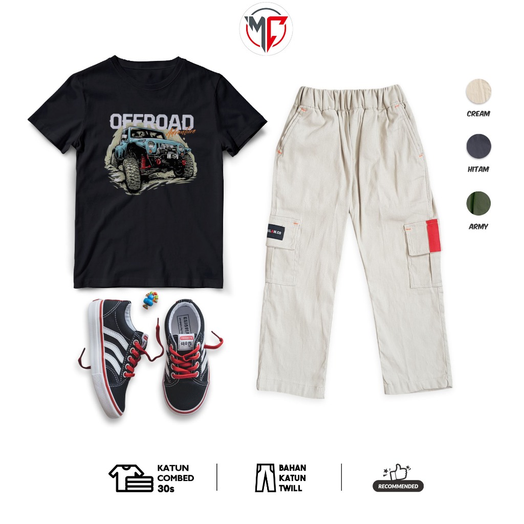 MAXIMO.CO SETELAN BAJU DISTRO ANAK OFF ROAD BLACK DAN CELANA CHINO KARGO PANJANG USIA 3-12 TAHUN