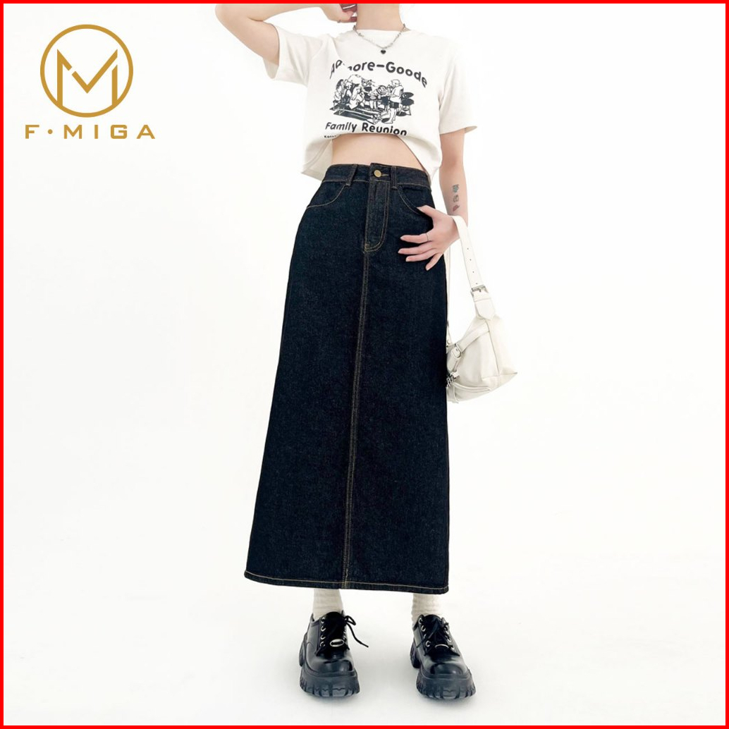 F Miga C77 High Waist A-line 3 4 Kasual Rok Denim Jeans Midi Wanita - Hitam