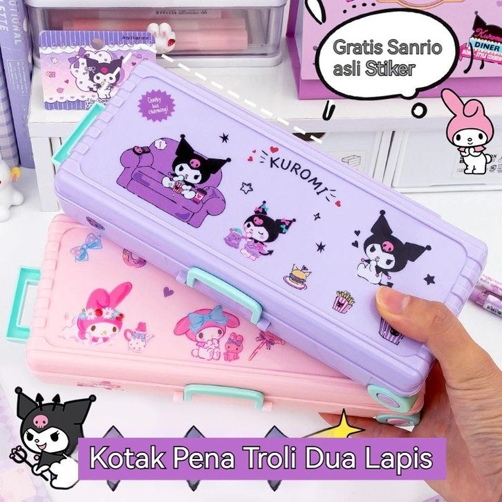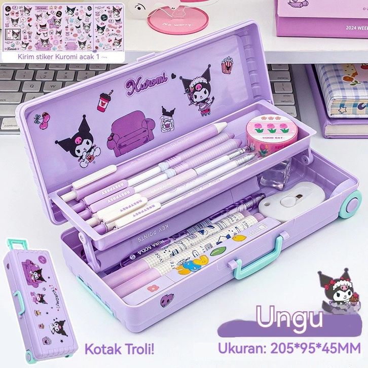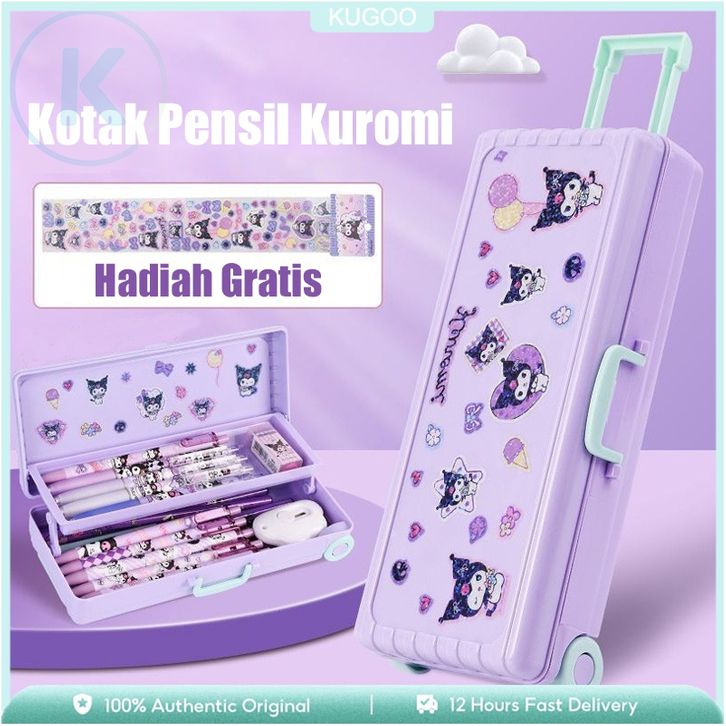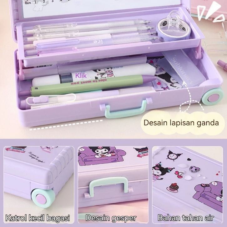 RK - KUGOO Kotak Pensil Kuromi Troli Lucu Kotak Alat Tulis Dua Lapis Kuromi Koper Kreativitas Kapasitas Besar PeM0DEela