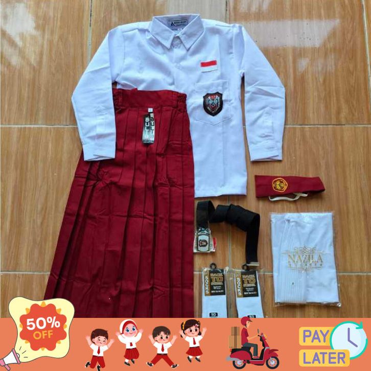Baju sekolah Seragam Merah Putih SD Panjang Setelan Anak Perempuan Usia 7 12 Tahun Bonus Jilbab Putih Perempuan