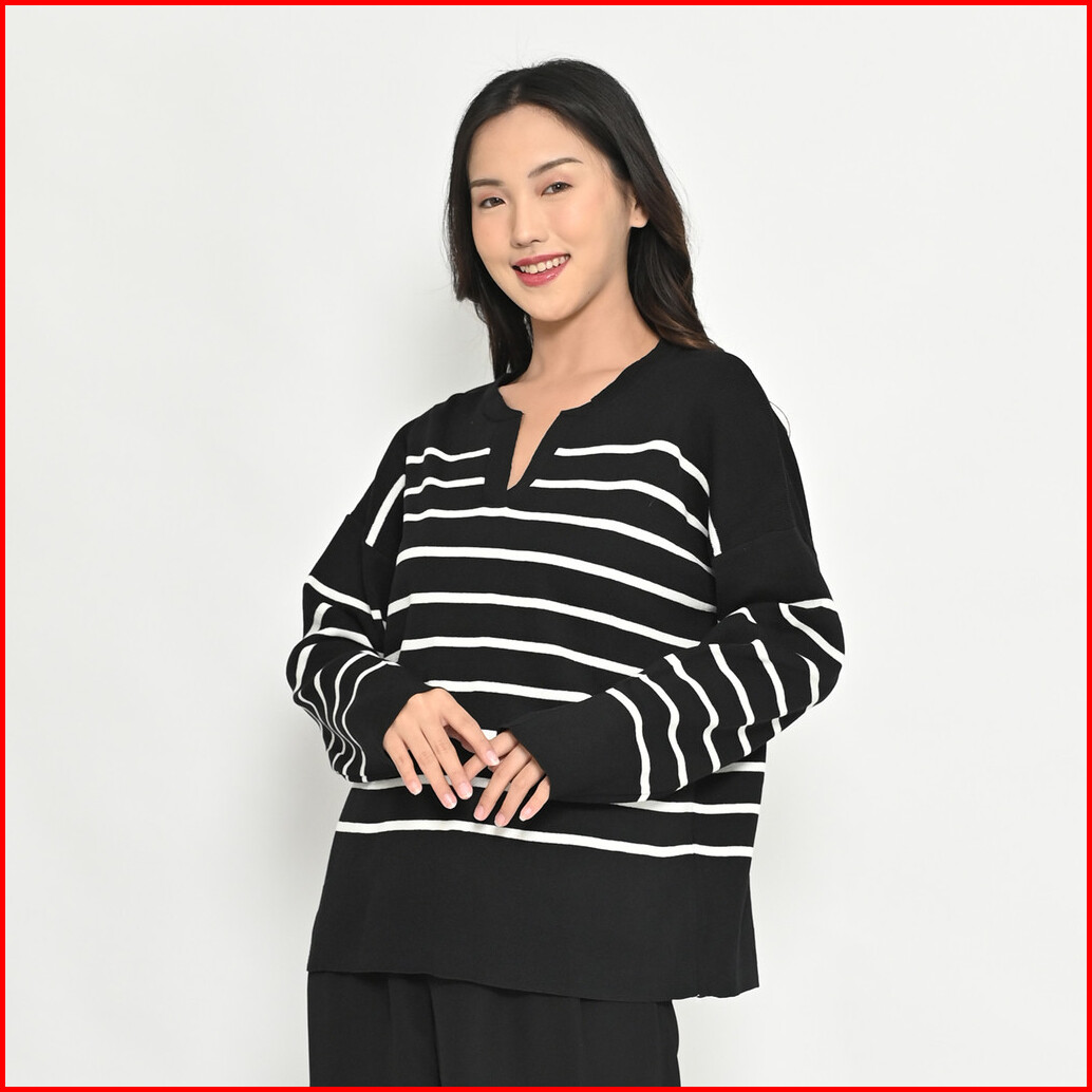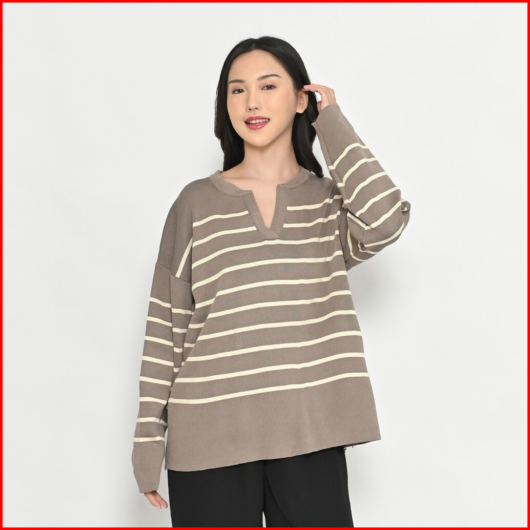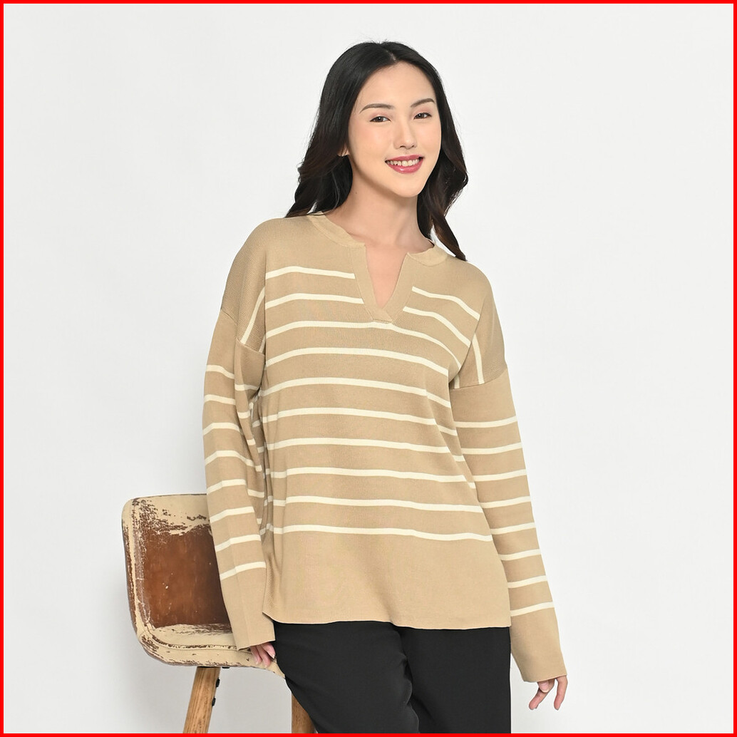 Queentin Sweater Wanita Rajut 3176 Viscose Polyamide Knit Motif Salur Lengan Panjang