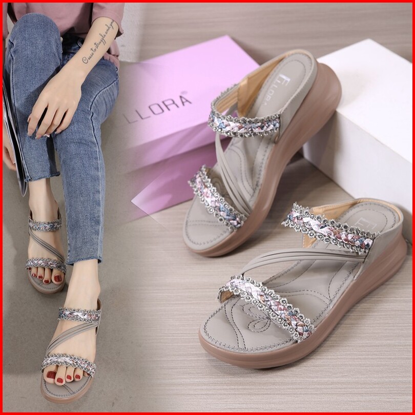 Ellora Eb330-04 Sandal Wedges Wanita Import Tanpa Tali 5cm