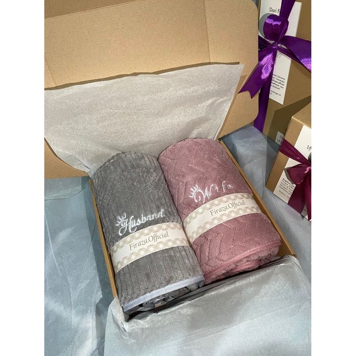 handuk mandi dewasa Firaza Official - Hampers Handuk Bordir Couple Souvenir Pernikahan Husband Wife - Gift Set Box T