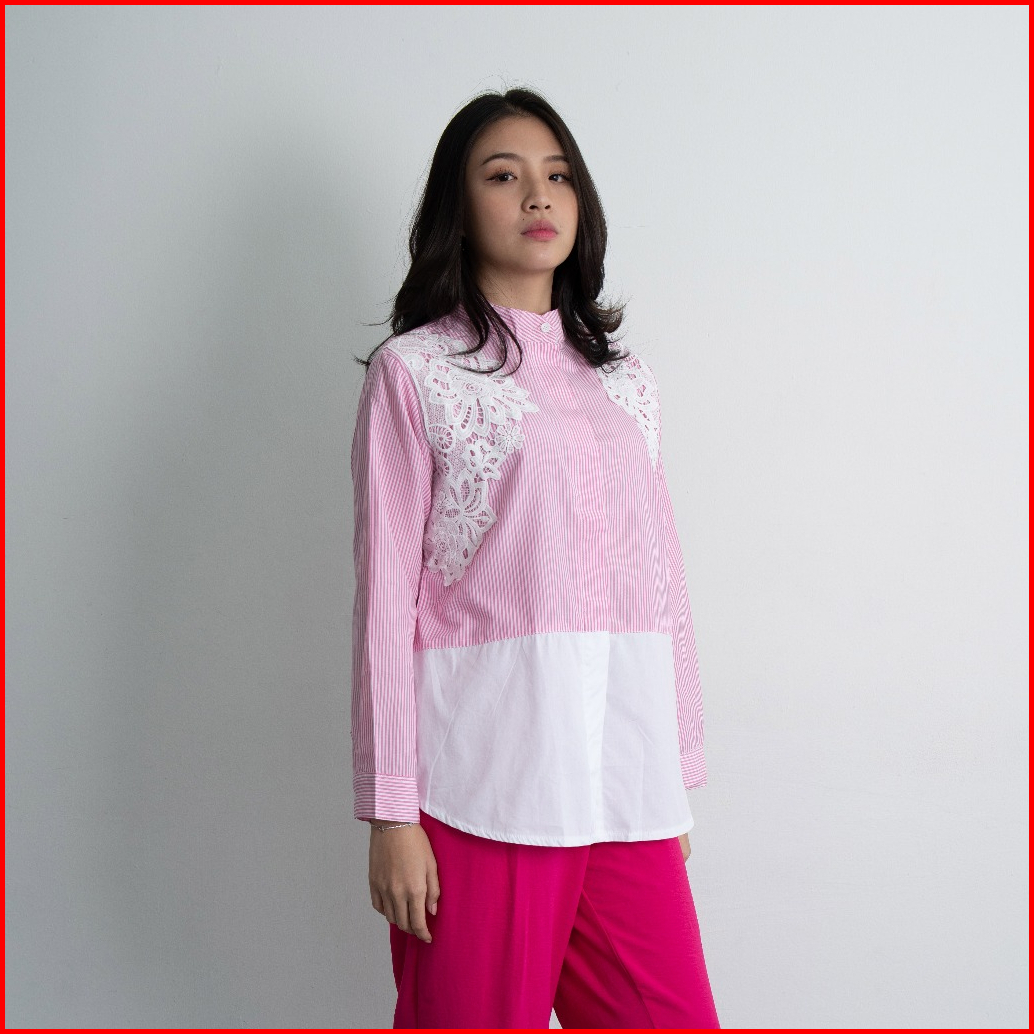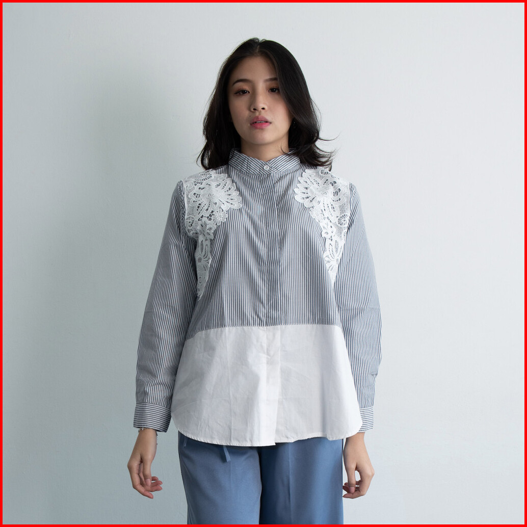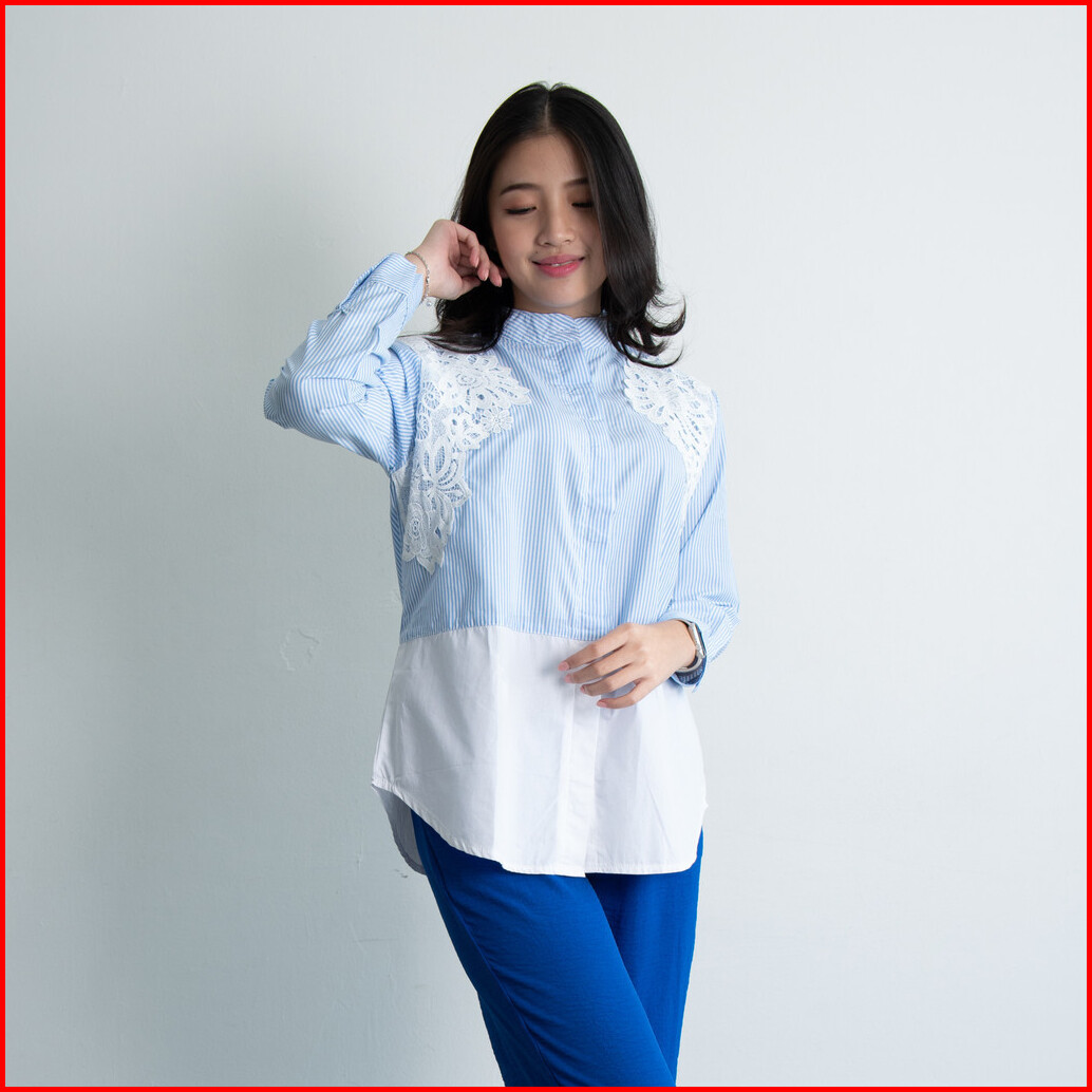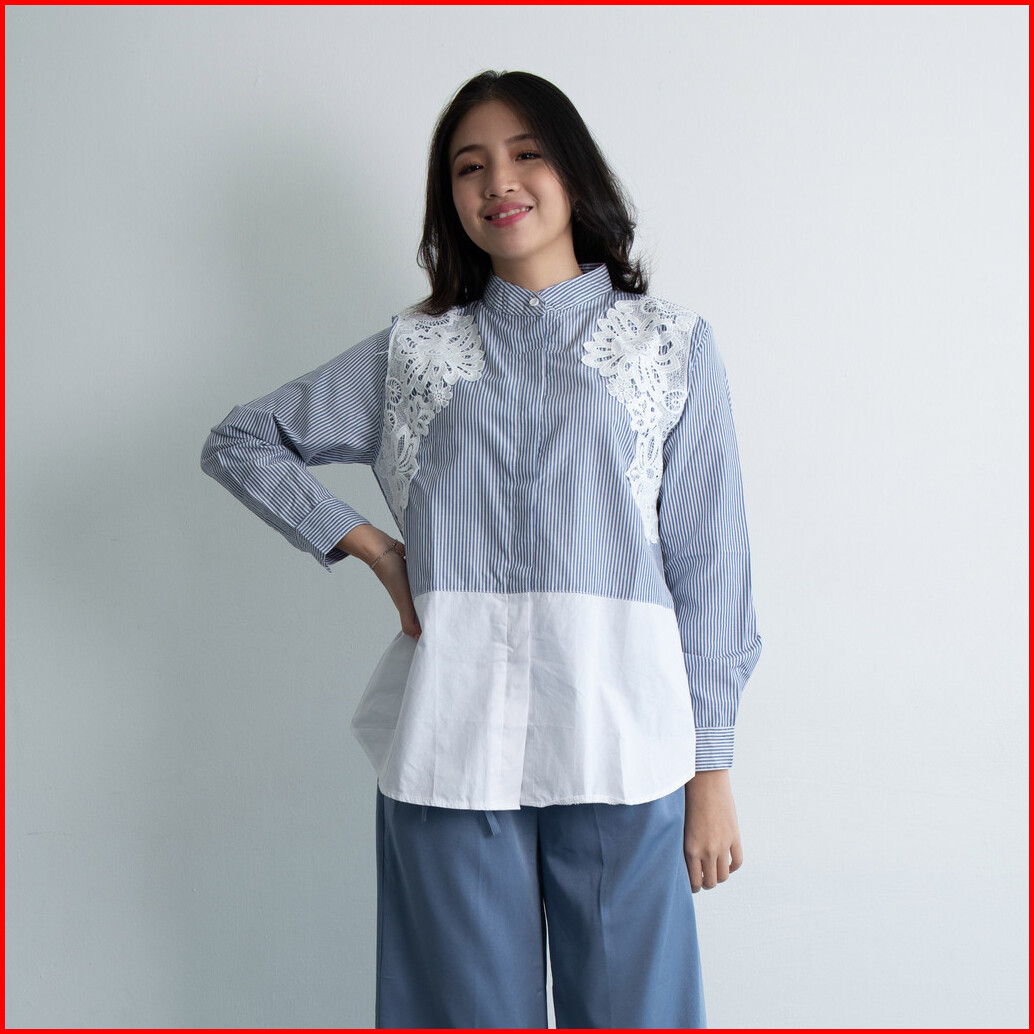 Queentin Kemeja Wanita Kombinasi 0574 Katun Polymicro Motif Salur Mix Katun Bordir Lengan Panjang