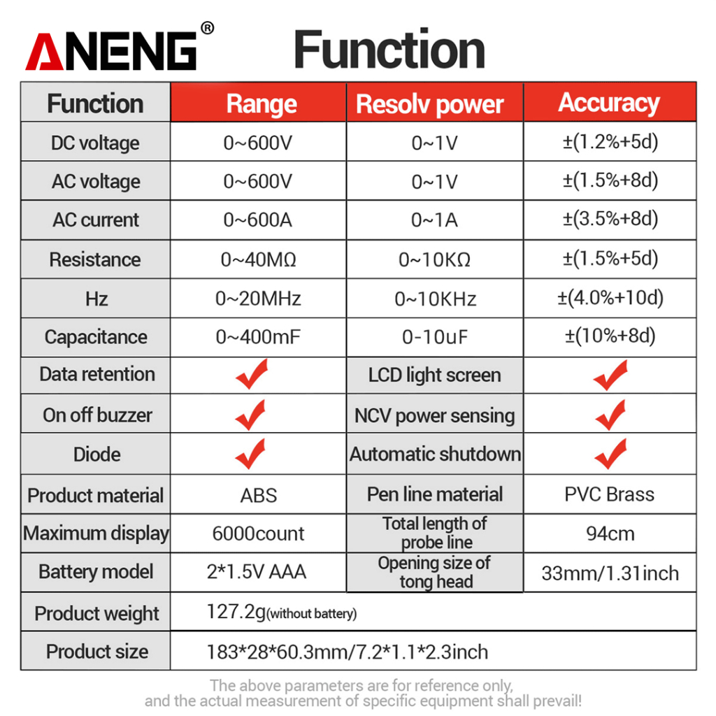 Aneng ST183 Tang Ampere Digital Multimeter Tester Clamp Original