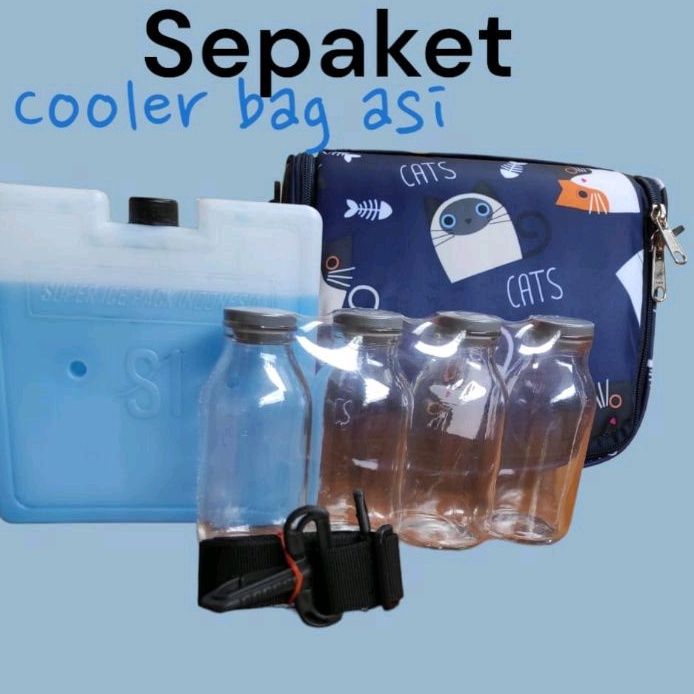 Sepaket Tas coller bag tempat penyimpanan ASI / Bekal makanan 4 botol asi plus ice gel 4 dan tali slempang