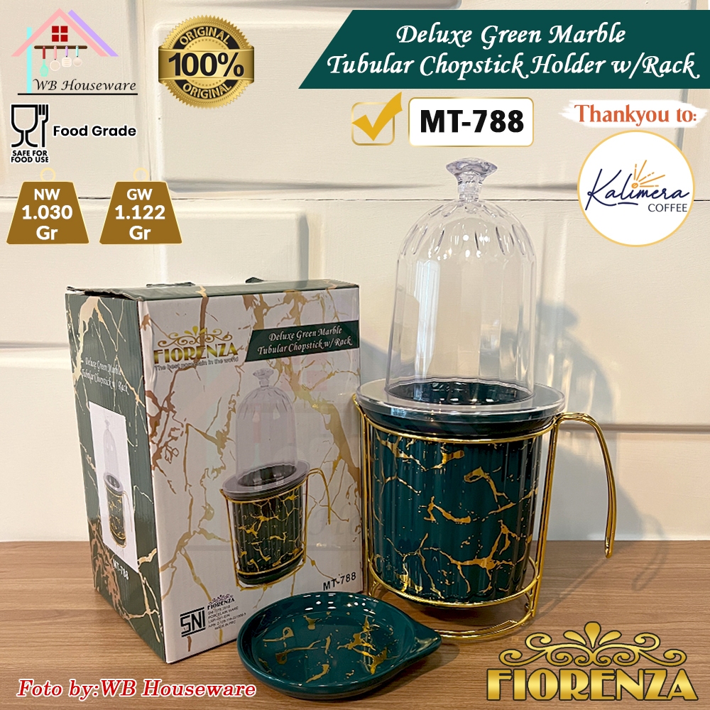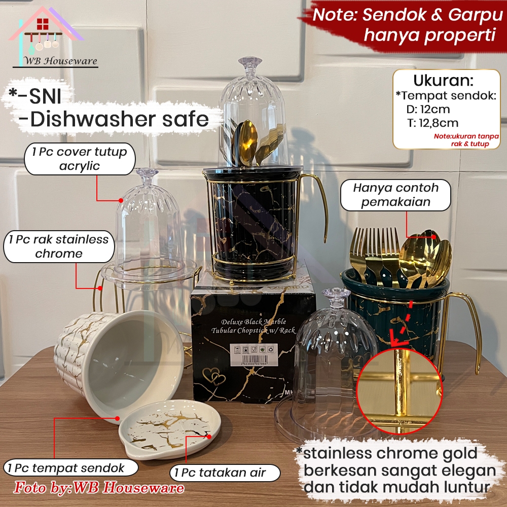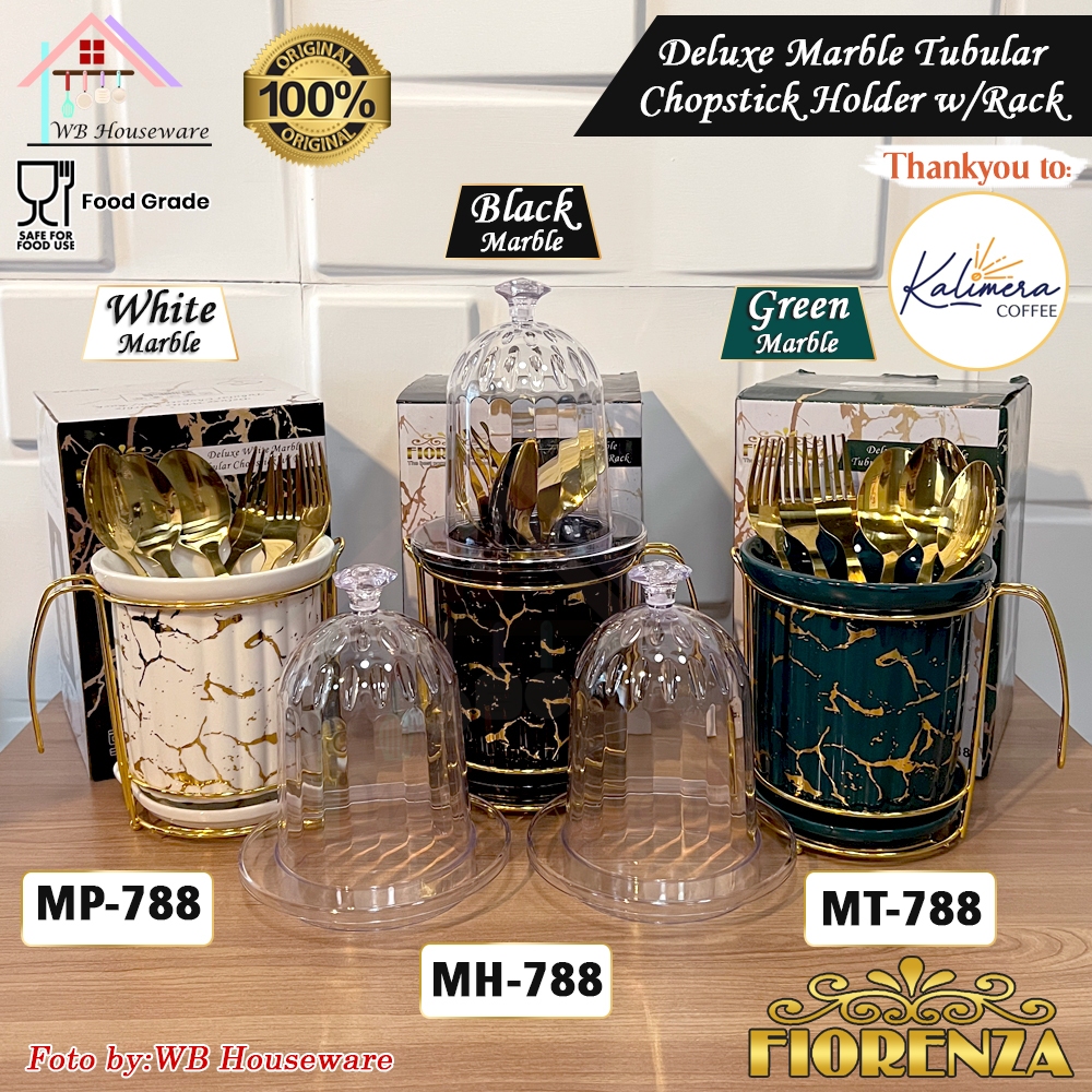 FIORENZA Tempat Sendok Garpu Keramik Set Motif Marble Series + Tutup Duluxe Tubular Chopstick Holder With Rack 788