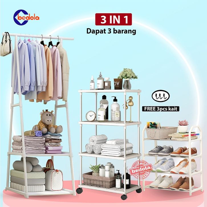 Paket Combo 3 in 1 triangle rak baju + rak dapur 4 tingkat dengan roda + rak sepatu 4 layer