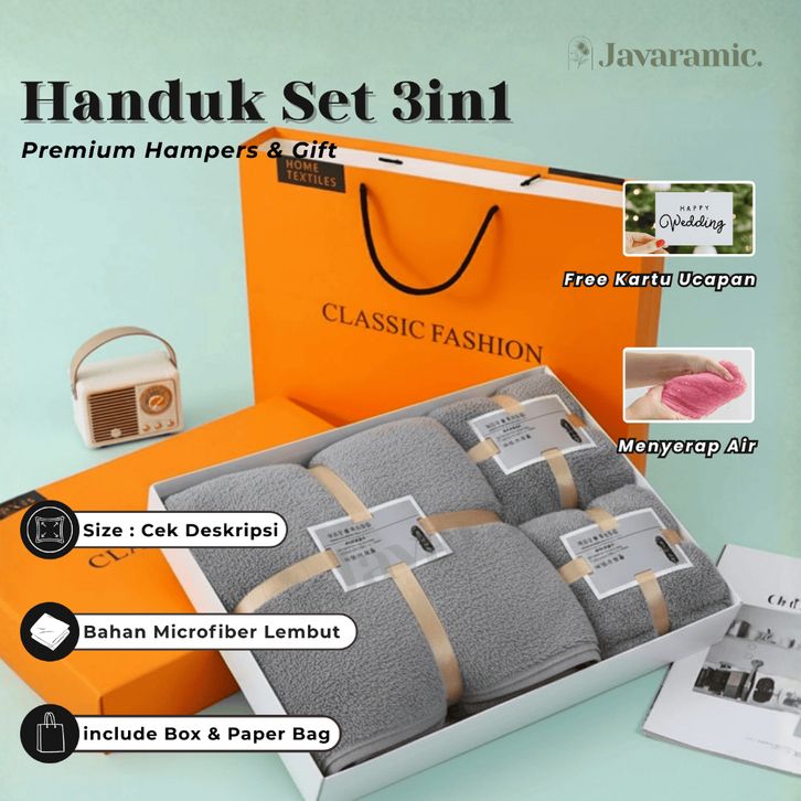 Handuk Set 3in1 Premium Microfiber | Handuk Mandi & Wajah + Box & Paper Bag | Souvenir Hampers Kado Mewah Cepat Kering