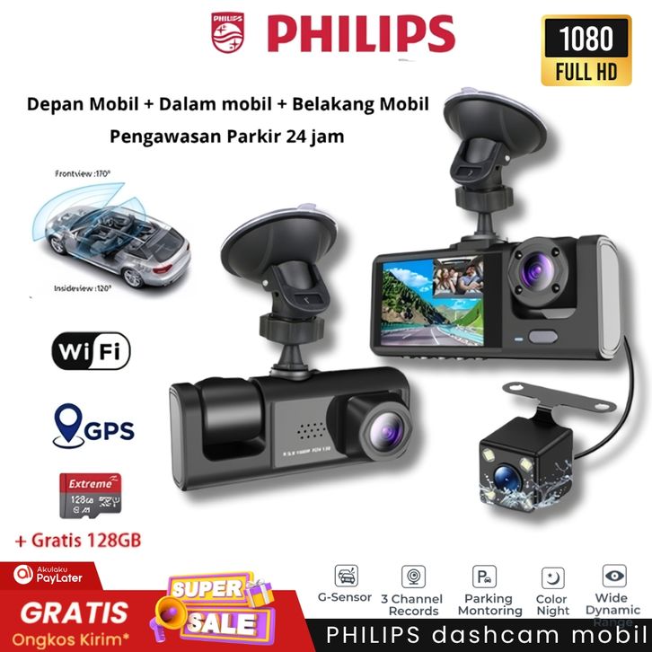 Philips Dashcam Mobil 3 Cameras 1080P HD Night Vision Loop Recording AI Cerdas Menangkap Pemotretan