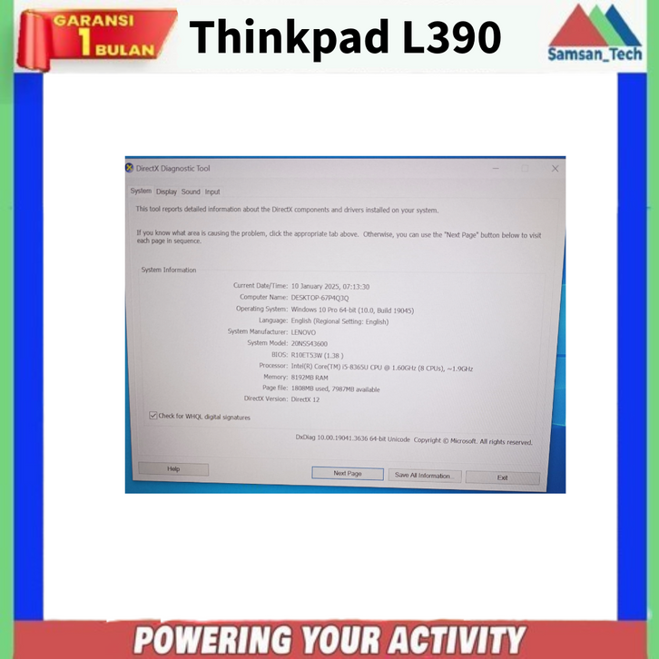 Laptop Lenovo Thinkpad L390 i5 Gen8 RAM 8GB SSD 512GB 14Inch MULUS
