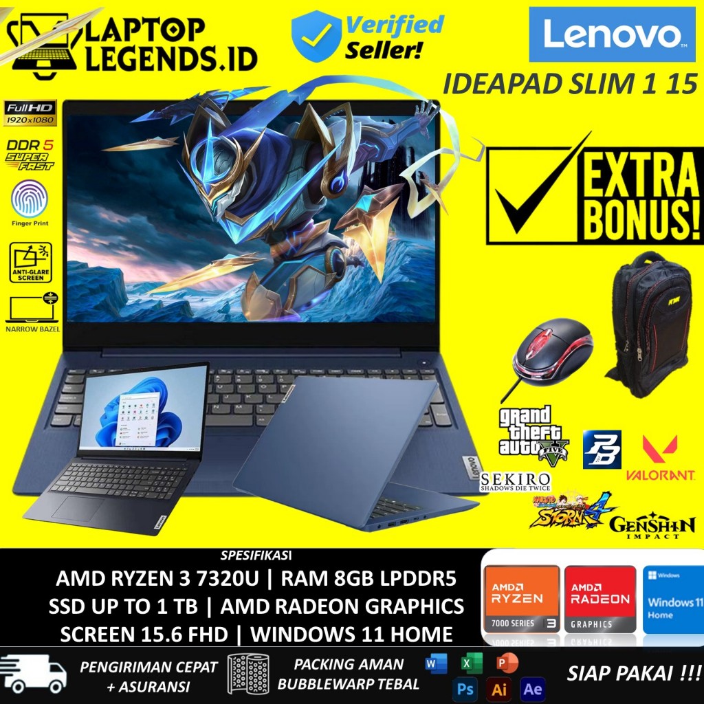 LAPTOP BARU LENOVO IDEAPAD SLIM 1 15 AMD RYZEN 3 7320U RAM 8GB DDR5 1TB SSD FHD FINGERPRINT