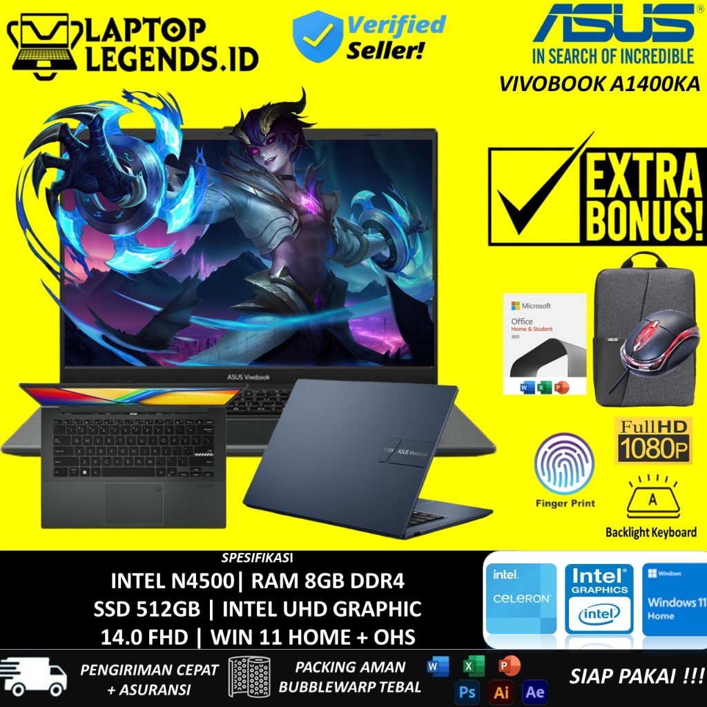 LAPTOP RESMI ASUS VIVOBOOK 14 A1400KA INTEL N4500 8GB 512GB 14.0 FHD BACKLITE KEYBOARD