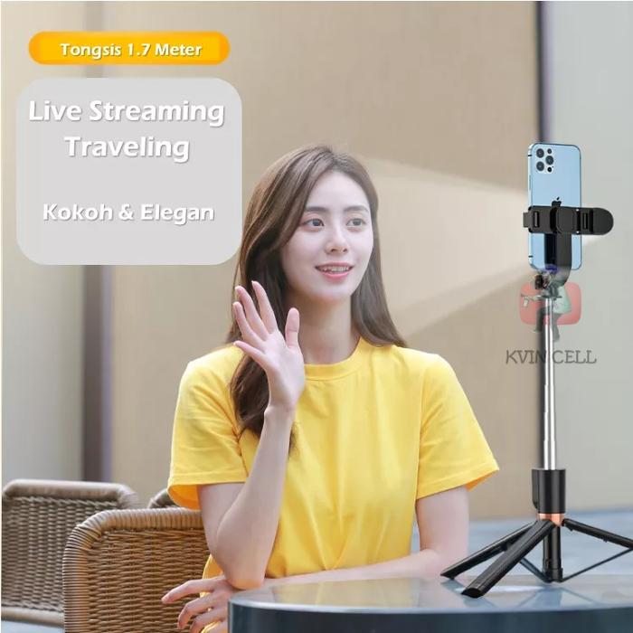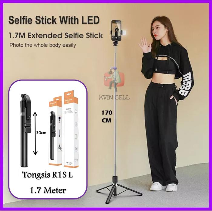 R1S L Tongsis Tri Bluetooth 1.7 Meter 170cm Selfie Stick 4 in 1 Portable 360° Lampu Remot Remote Panjang