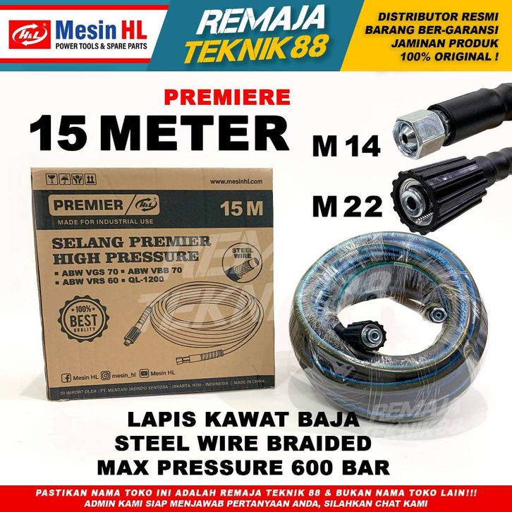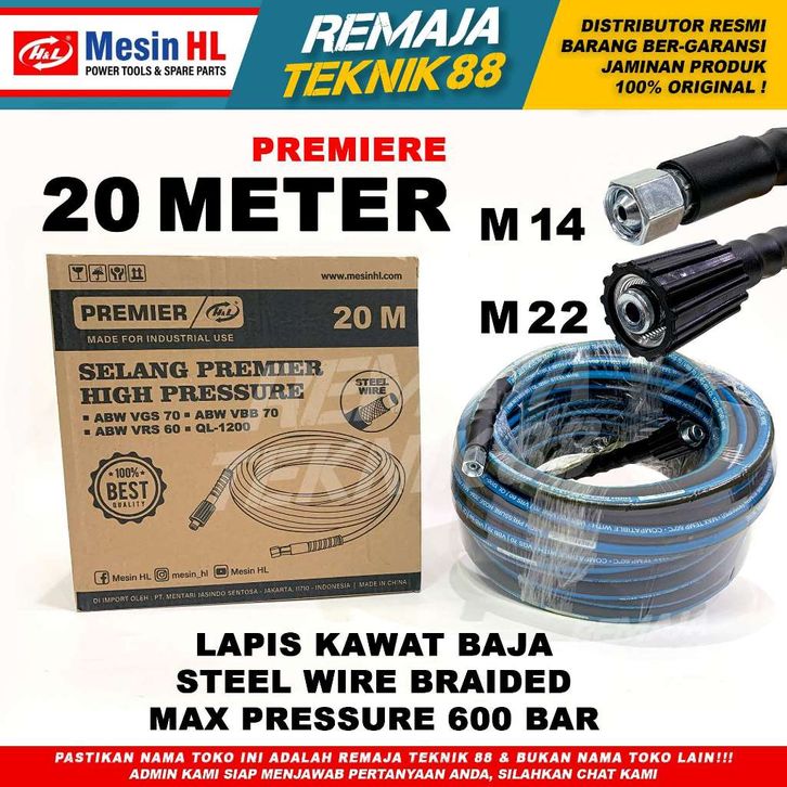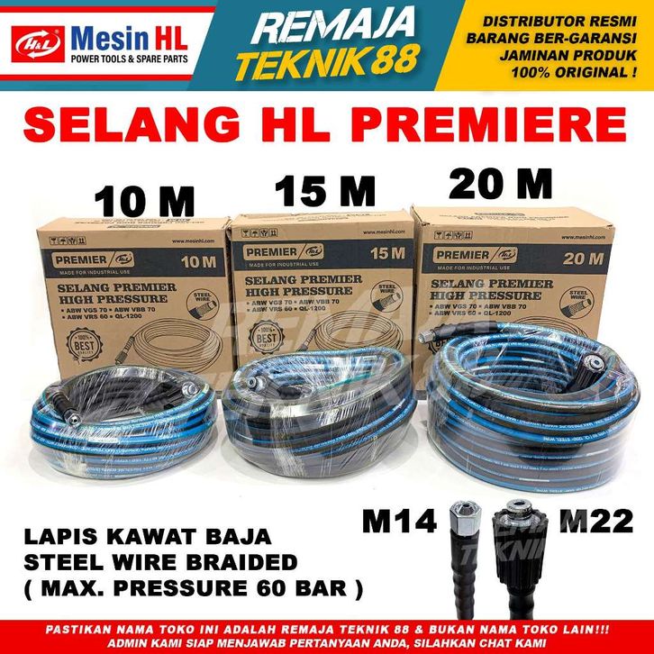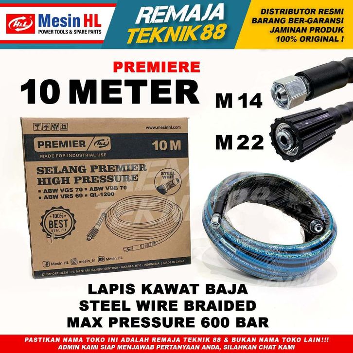 Selang Jet Cleaner Lapis Kawat Baja PREMIER / H&L HL QL 1200 / Mesin Steam High Pressure Hose Max.600 Bar
