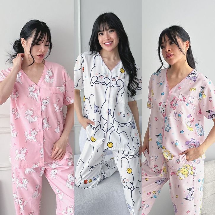 Piyama Celana Panjang Set katun | tanpa kerah Vneck - Baju tidur wanita set