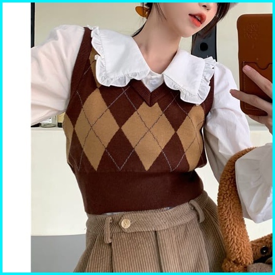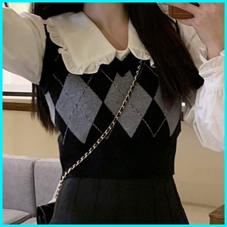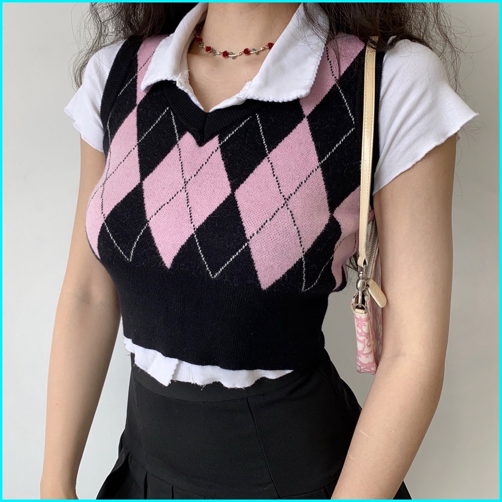 Aera Korean Diamond Plaid Knit Vest Crop Top Rompi Rajut Korea