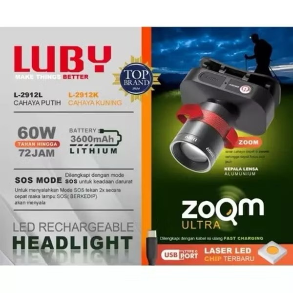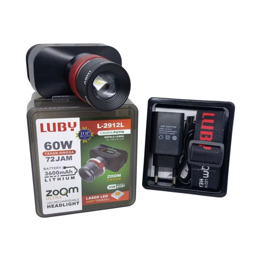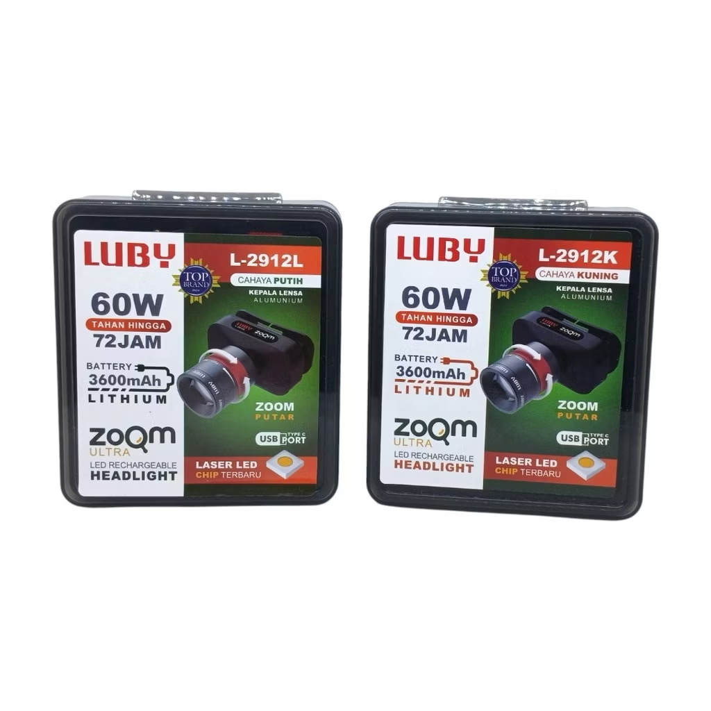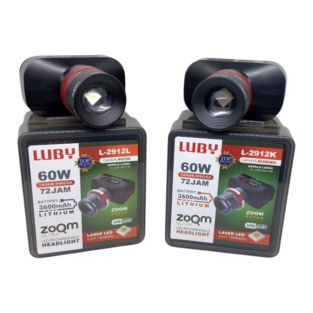 Senter Kepala Luby 60 Watt L 2912L 2912K Cahaya Putih Kuning Baterai Cas Headlamp 2912 K Zoom L