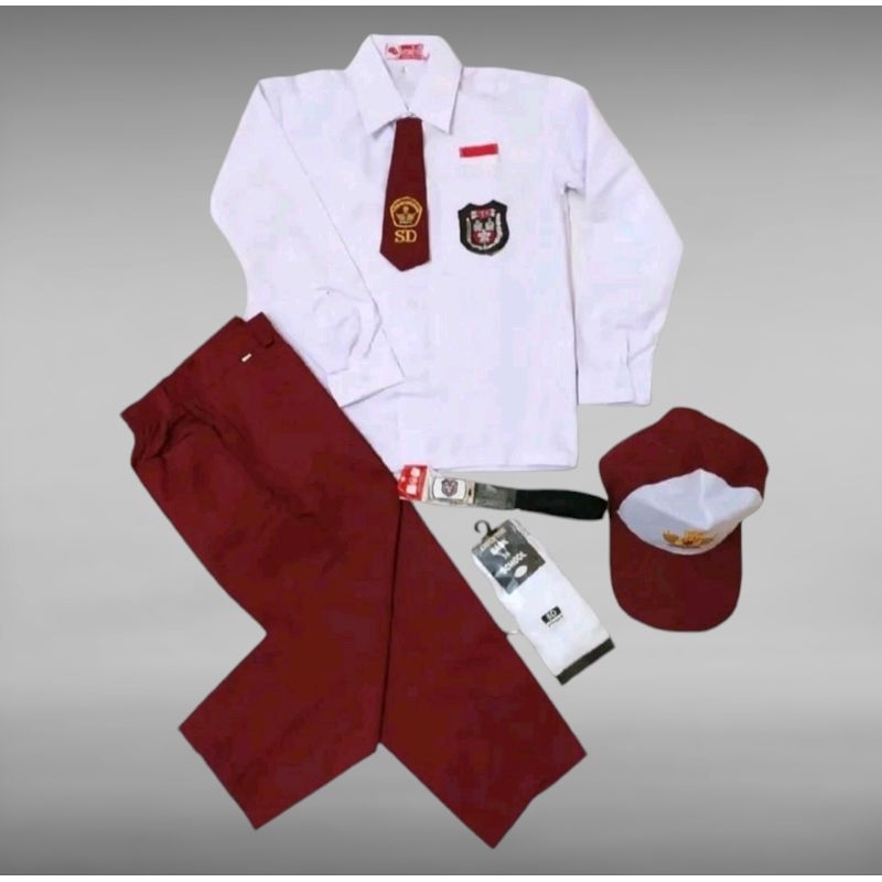 setelan seragam sekolah SD kls 1-6 merah putih anak laki lengan panjang celana merah panjang
