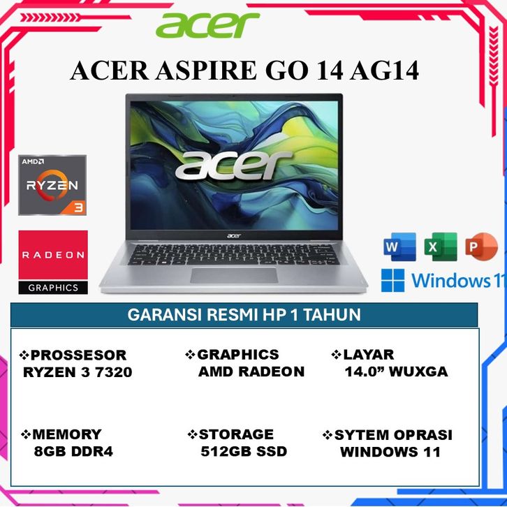 ACER ASPIRE GO 14 AG14 RYZEN 3 7320 8GB 512GB Win11 + office 14.0WUXGA