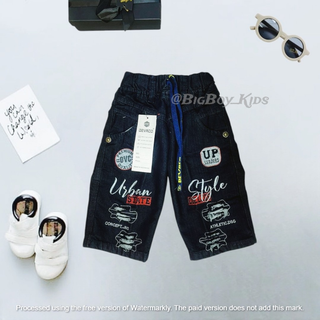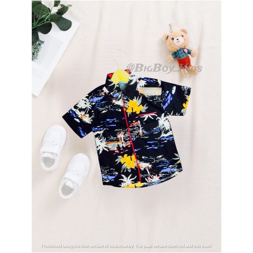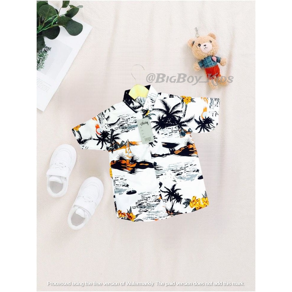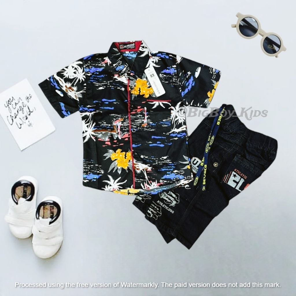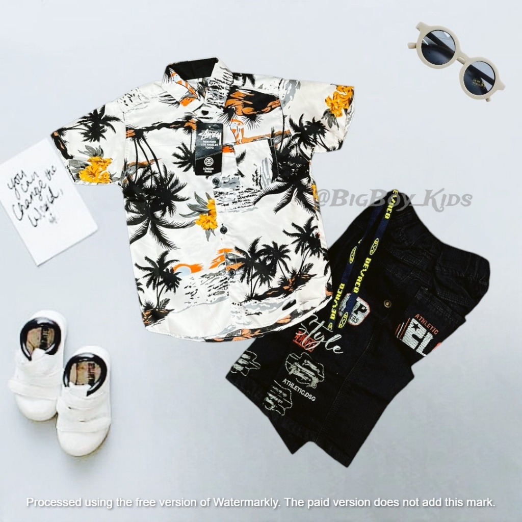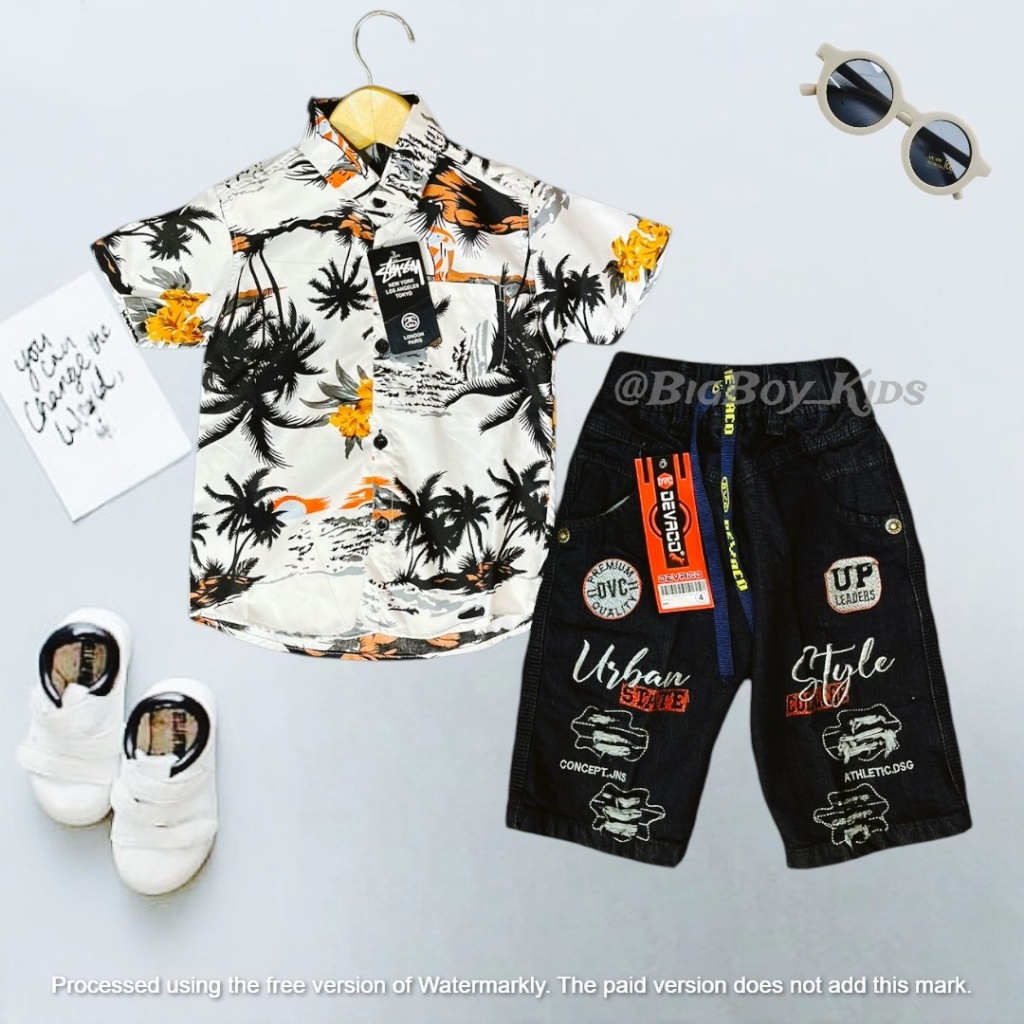 Setelan Kemeja Motif Pantai Celana Denim Sobek Hitam Pendek Usia Anak 1-12 Tahun