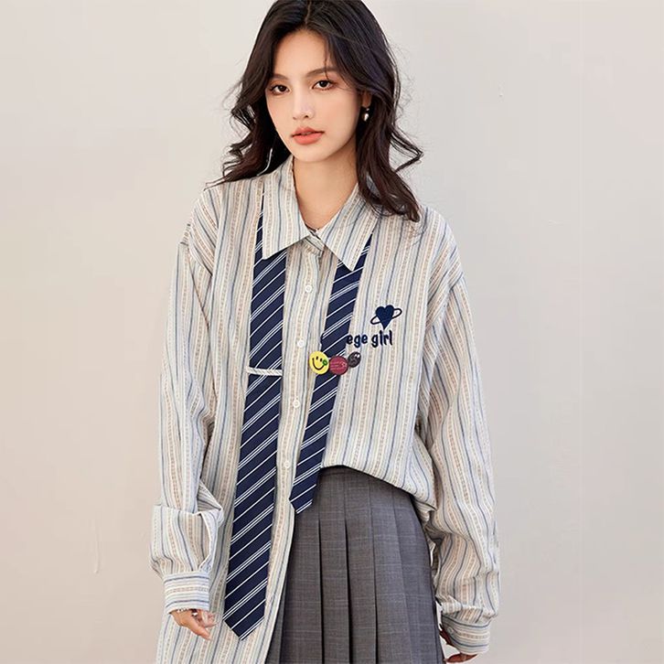 MEET.U【Dasi kado】Kemeja Dasi Bergaris Korean Kemeja Wanita Lengan Panjang Atasan Wanita Oversize