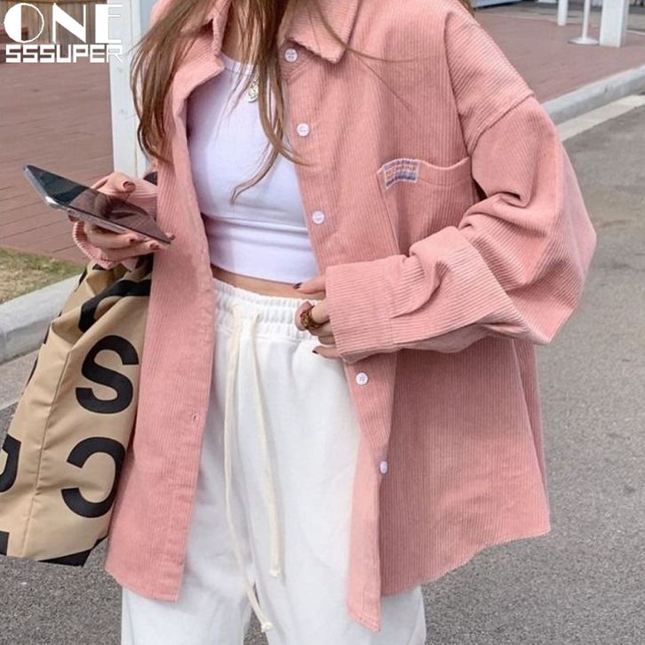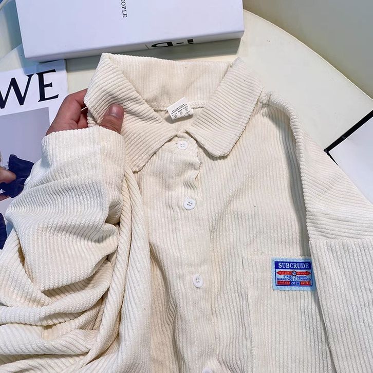 Kemeja Corduroy Wanita Jaket Lengan Panjang Polos Korea Retro Longgar Atasan Fashion Shirt