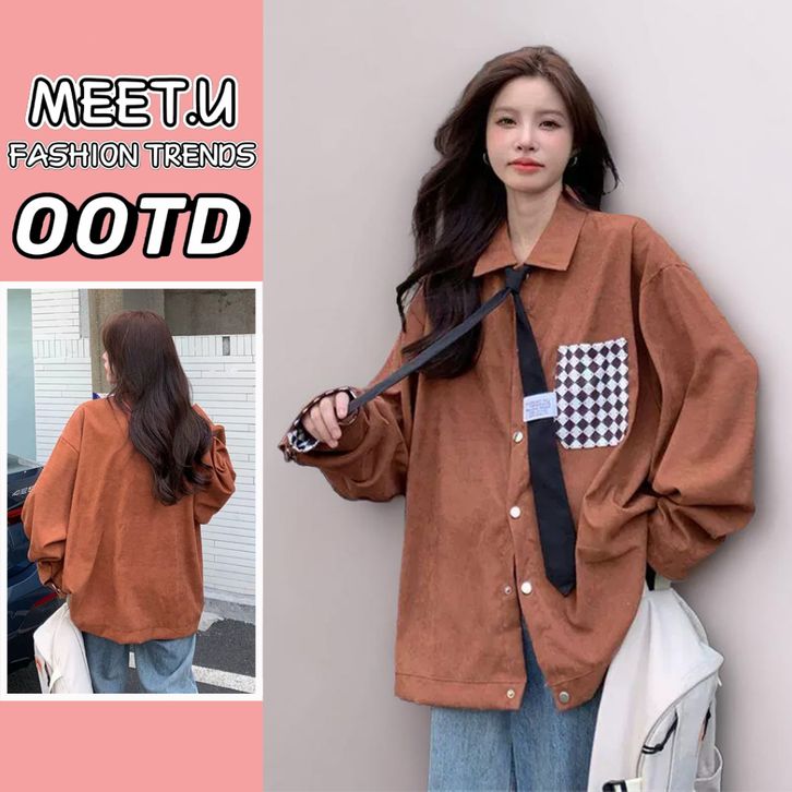 Meet.U Kemeja Corduroy Korean Retro Kemeja Wanita Oversize Atasan Lengan PanjangBonus Dasi Lencana