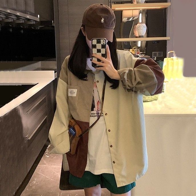 Kemeja Korduroi Gaya Korea Retro Warna Kontras Lengan Panjang Atasan Wanita Jahitan Pink
