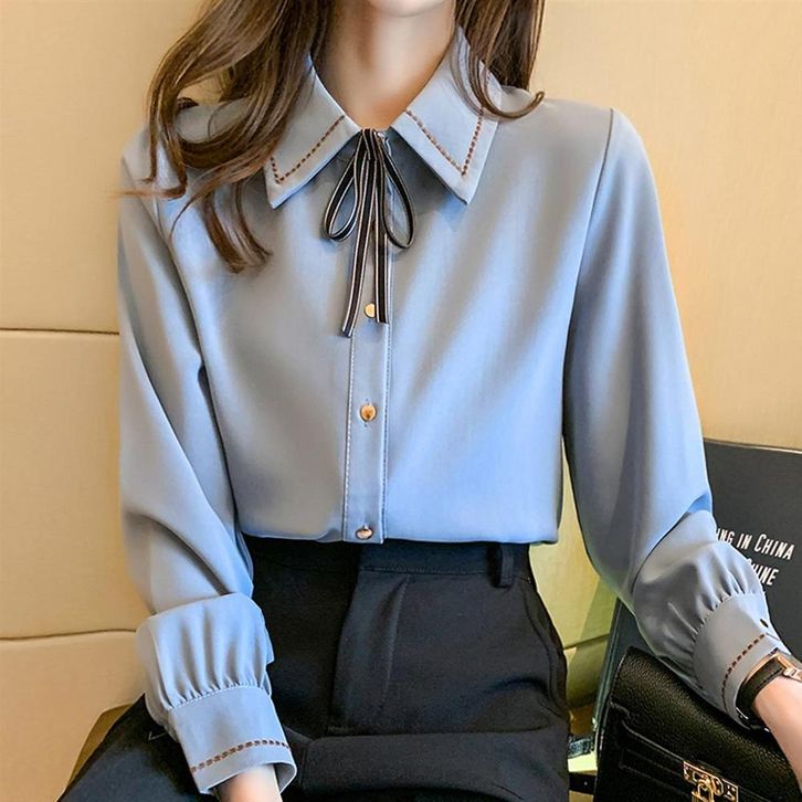 Kemeja Sifon Wanita Lengan Panjang Kemeja Ikatan Simpul Baru