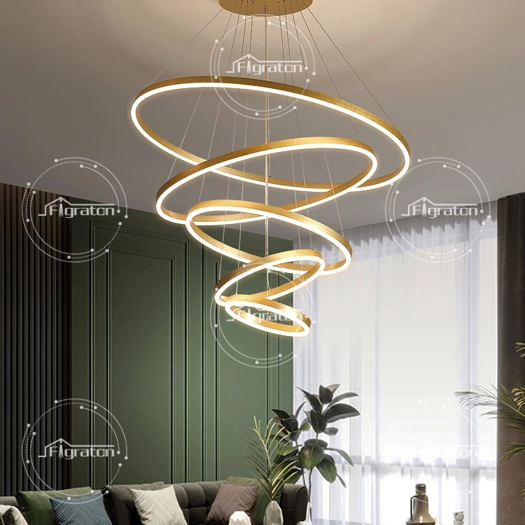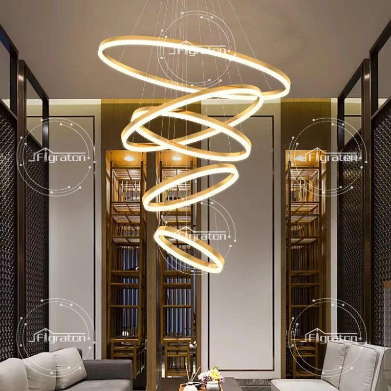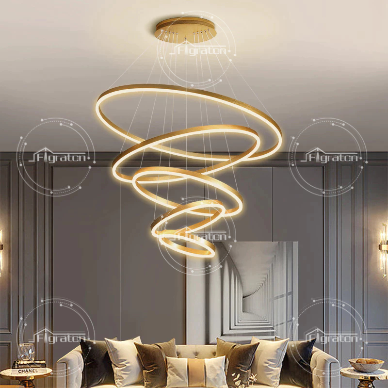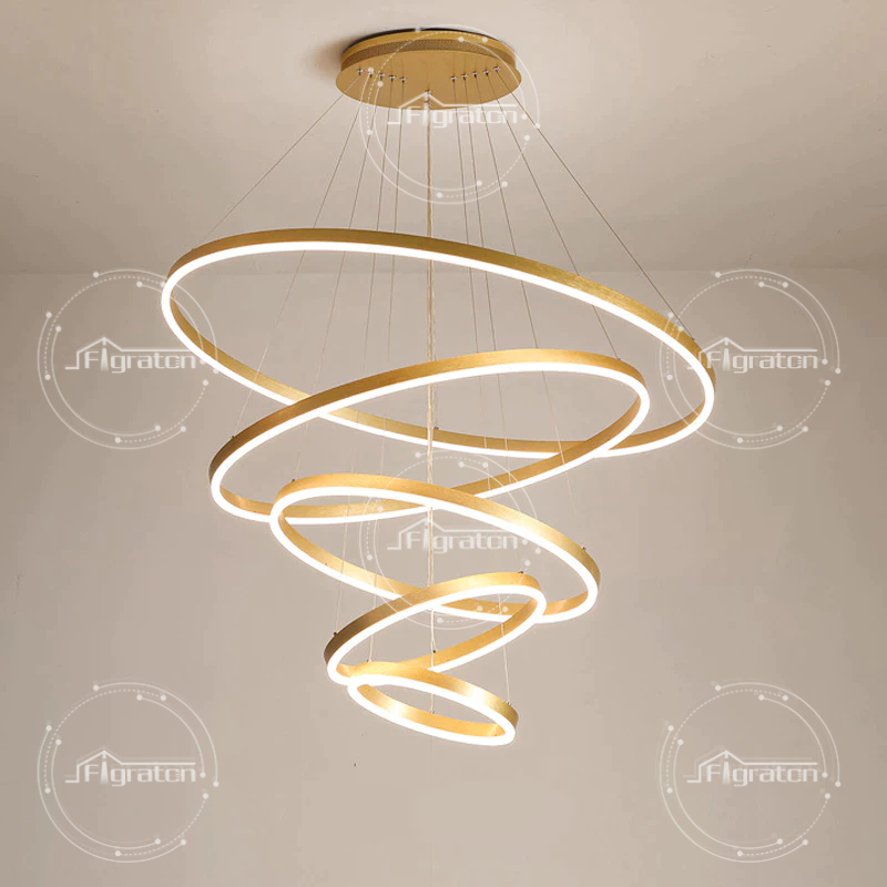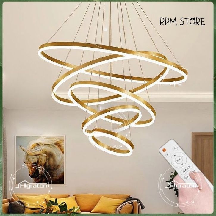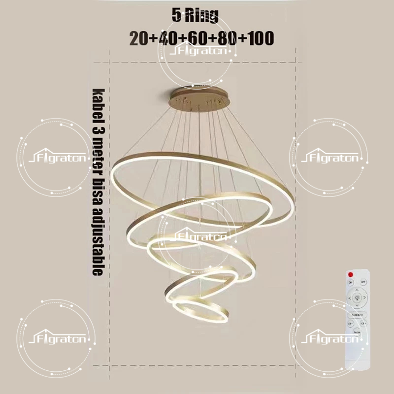 Lampu Gantung Ruang Tamu 5 Ring Minimalis Modern Lampu Hias Gantung LED 3 Warna 120cm 100cm GOLD Void Tangga Vila Hotel