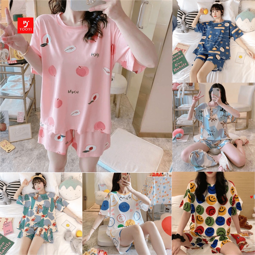 Yooyi Baju Tidur Wanita Piyama Korea Lengan Pendek Celana Pendek Motif Kartun Lucu Setelan Tidur Hotpants Murah Model Kaos Korea Fit to XXL 004