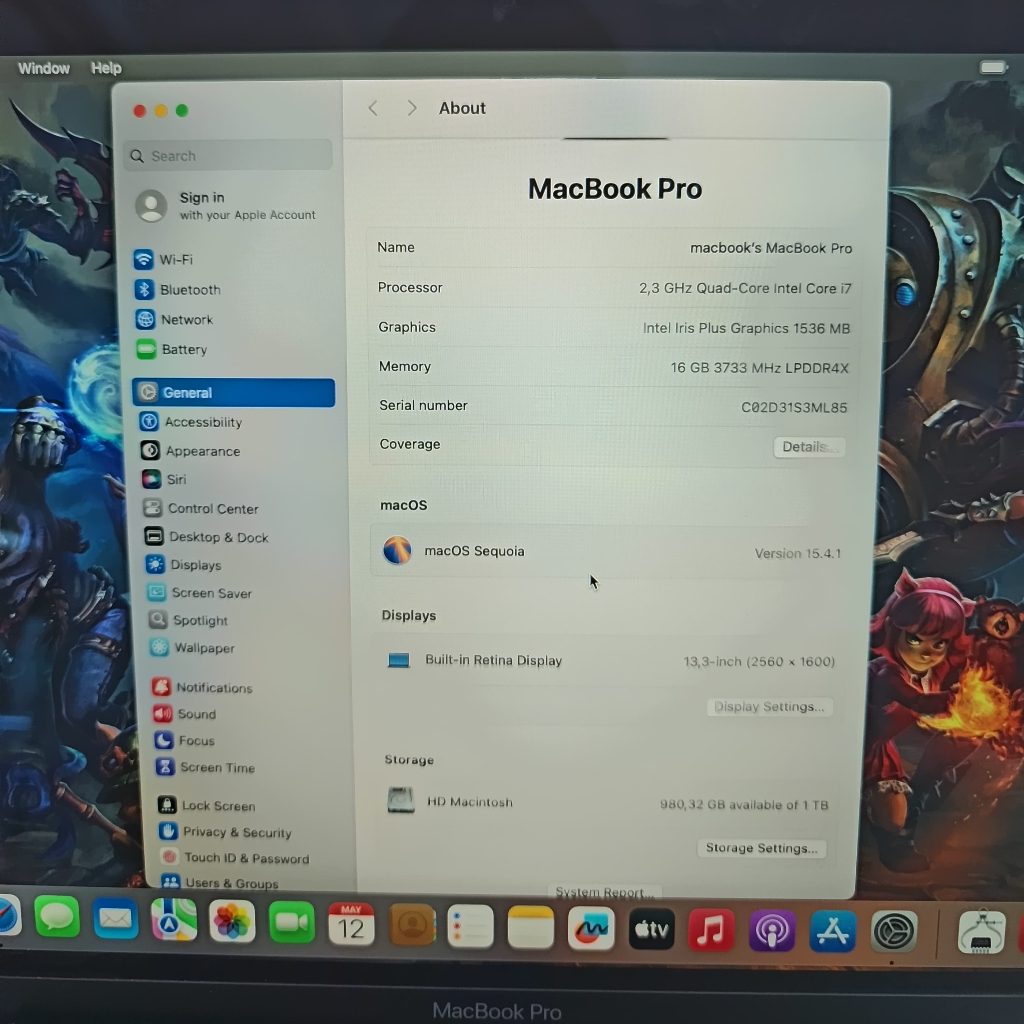MACBOOK PRO 2020 13" QUAD CORE I7 16/1 TB TOUCHBAR MINUS LAYAR BLUE SPOT