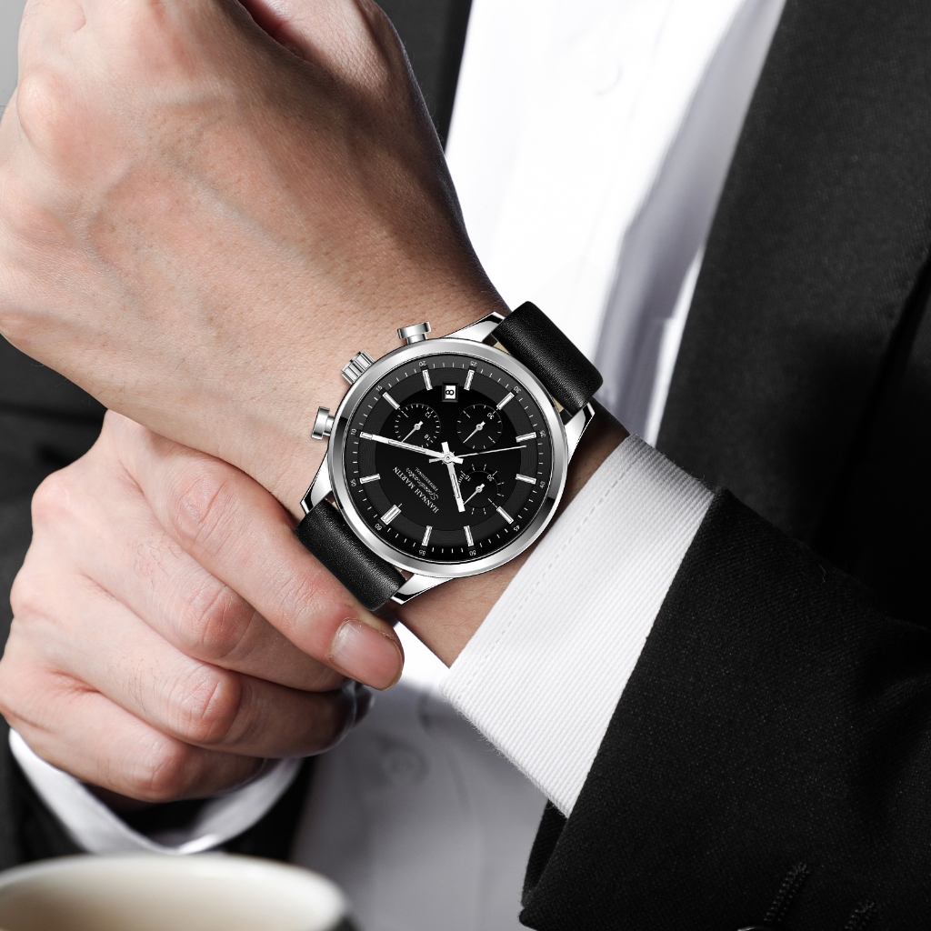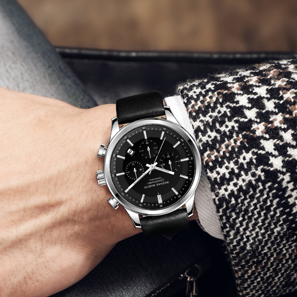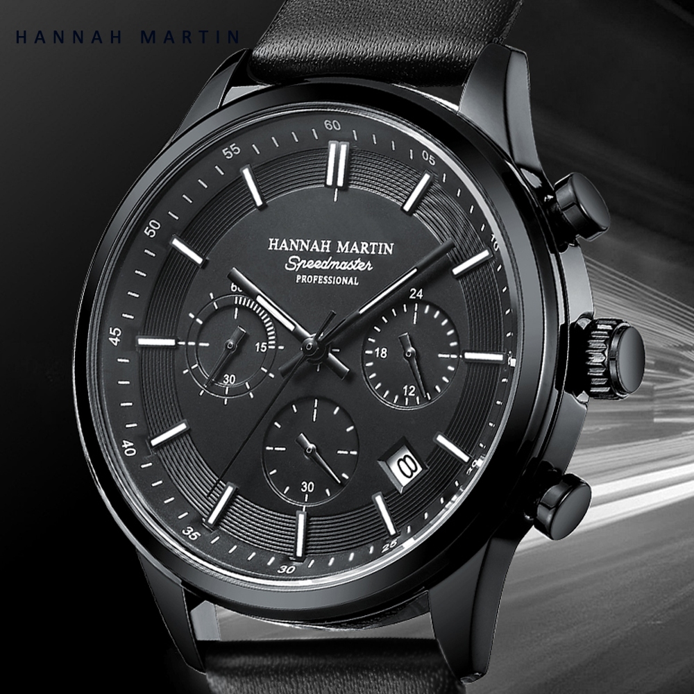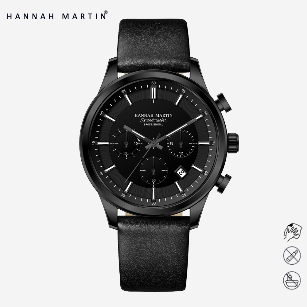 HANNAH MARTIN JAM TANGAN PRIA 100 PERSEN ORIGINAL KRONOGRAF PREMIUM HITAM KULIT TAHAN AIR QUARTZ ANALOG LAKI JAM COWOK ANTI AIR 1431