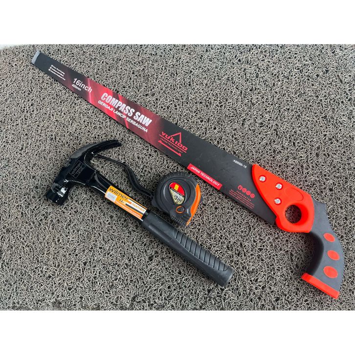 Paket Tukang - Gergaji Kayu Baja Asli Siap Pakai - Palu Kambing 12oz Magnet - Meteran Viper 3 Meter