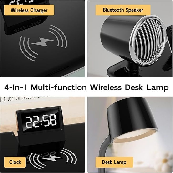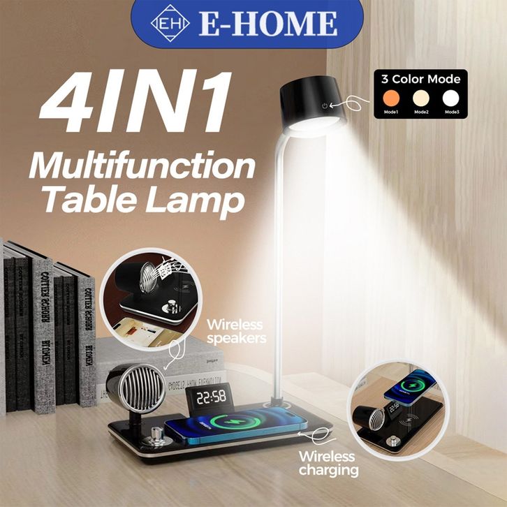 E-Home Lampu Meja 4-in-1 Pelindung Mata Led Lampu Multifungsi dengan Speaker Bluetooth Pengisian Nirkabel Jam