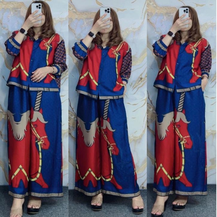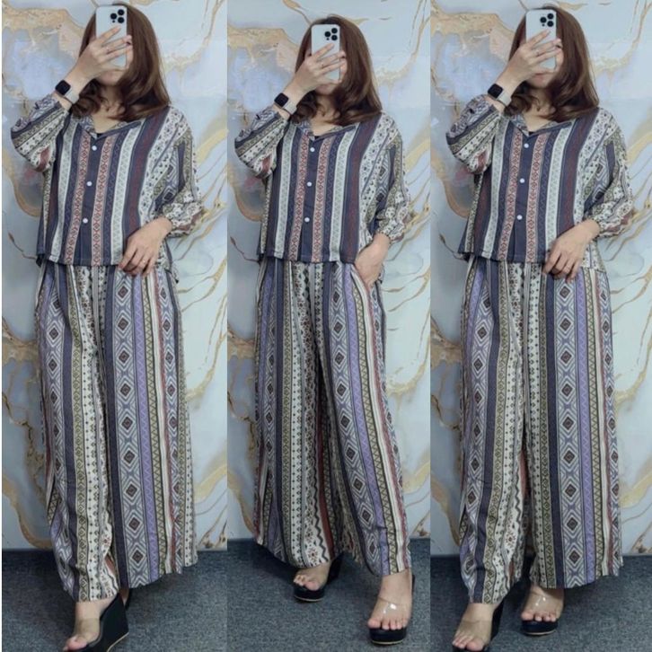 One Set Crop Setelan Celana Kulot Wanita Hightwaist Lengan 7/8 Rayon Premium Busui Friendly Kancing - Setelan Celana Ku