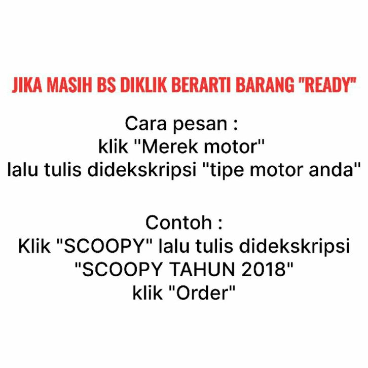 Beat Dealux/street, Beat Esp 2016-2020, Beat FI 12-16 awal, Beat Karbu, Beat delux 2024/gen2, Beat pop, CB 150 R New, CB 150 R old, CRF ori, Fino 125, Fiz R tanpa bok, Freego, Fu barong, Fu facelift ori, Genio, KLX 150 BF DT ori, MX king v2, MX new, MX old tanpa bok, Mio J, Mio M3, Mio smile, Mio soul GT 115, Mio soul karbu, Mio sporty dgn bok, Mio sporty tanpa bok, Mx king v1, New Vixion NVA ori, Ninja RR Old, Ninja SS, Revo Fit fi, Revo absolut, Revo lama ori, Satria Fu cbu ori, Satria Hiu 2 Tak, Scoopy 2017-2019, Scoopy karbu 10/12, Scoppy 2021-2023, Supra GTR, Supra fit new, Supra x 125, Supra x lama, Tiger Pece, Vega R new, Vega ZR, Vixion NVL, Vixion R, Vixion old, XRide 115, scoopy FI 13-16