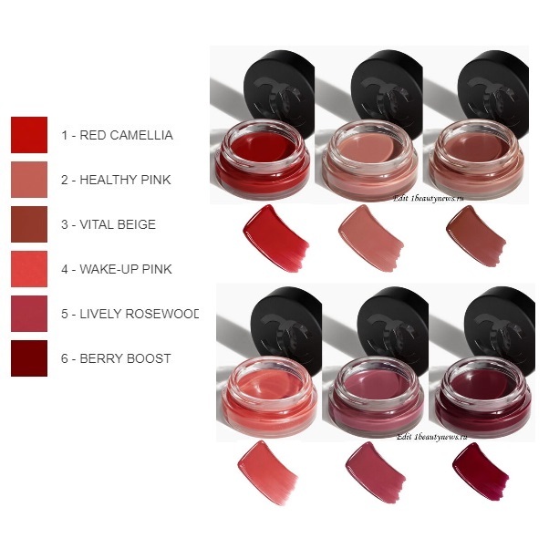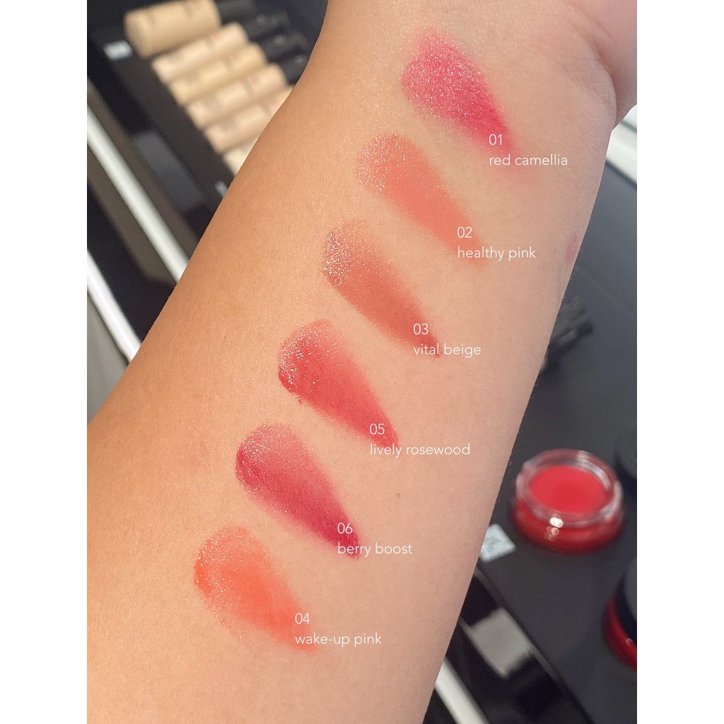 01 Red Camellia, 02 Healthy Pink, 03 Vital Beige, 04 Wake-Up Pink, 05 Lively Rosewood, 06 Berry Boost